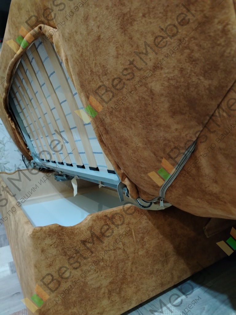Мы выбрали пеструю обшивку и жёлтые подушки. Диванчик получился как картинка. Выглядит очень аккуратно, чехол можно снять. Легко раскладывается.