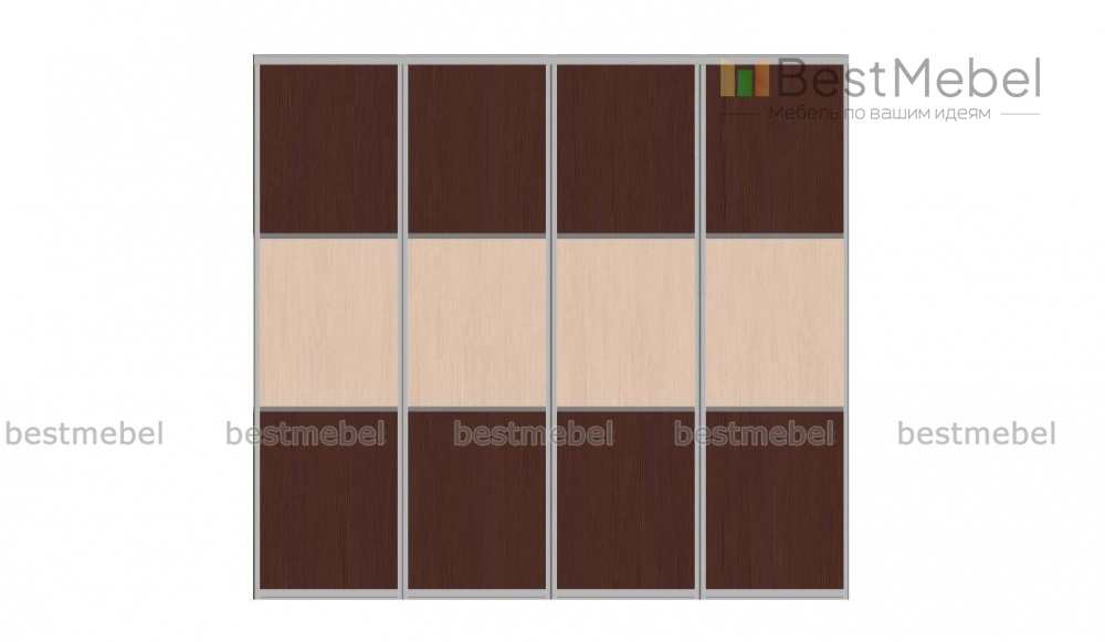 Двери-купе Лиссо 1 BMS сочетают в себе надежность, универсальный современный дизайн и доступную цену. В комплект входят четыре створки, выполненные из ЛДСП в контрастных древесных тонах и заключенные в рамы из профиля классического серебристого оттенка. Поверхности глухих полотен просты в уходе и долговечны, благодаря чему фасад гардеробной сохранит эстетичный вид на протяжении всего срока службы. Купить двери-купе Лиссо 1 BMS вы сможете в нашем интернет-магазине с учетом необходимых размеров.
