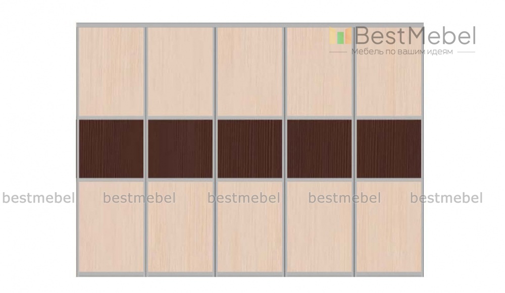 Двери-купе Ноче 2 BMS – это современный универсальный дизайн, надежность в эксплуатации и демократичная цена. Пятидверный фасад для вместительной гардеробной выполнен из ЛДСП в контрастных древесных тонах, отличаясь простотой ухода и износостойкостью. Необходимую прочность и долговечность раздвижным дверям придает каркас из алюминиевого профиля в оттенке серебро. Купить двери-купе Ноче 2 BMS вы сможете в нашем интернет-магазине с подбором размеров и цветового решения.