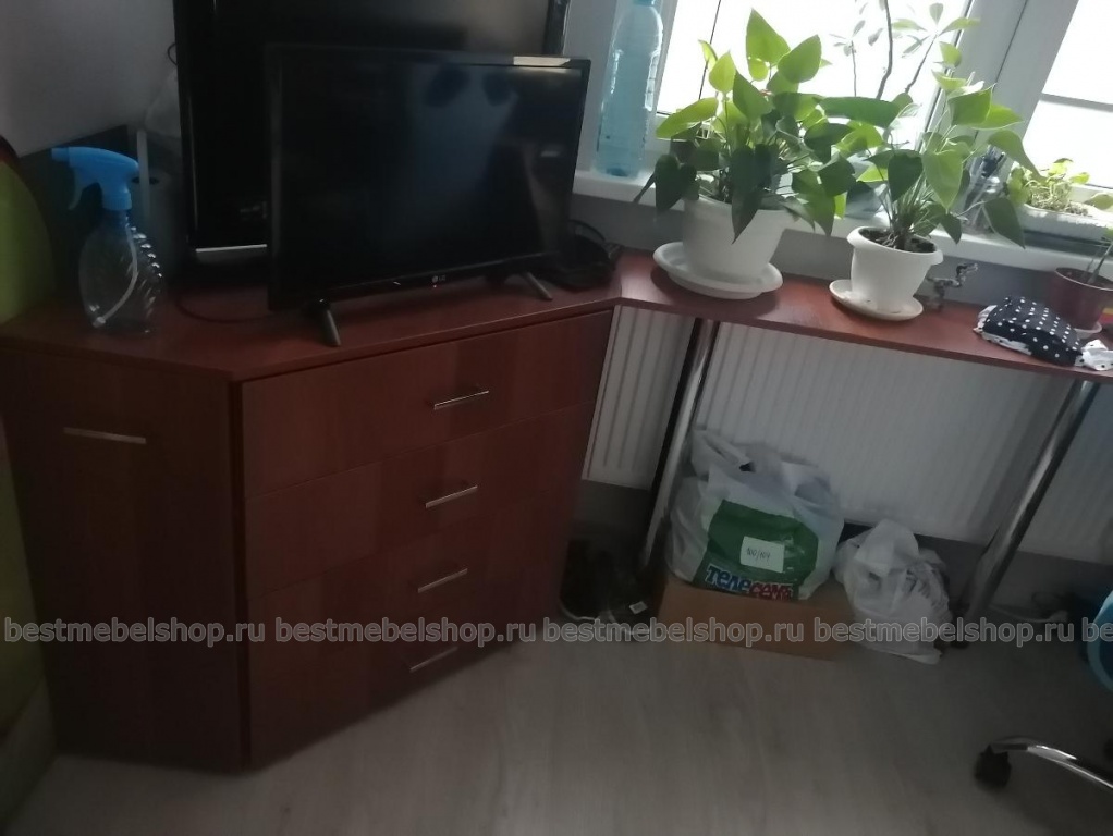 Угловой комод удобен тем, что на него можно поставить телевизор, а не вешать на стену или использовать его для косметики. Ящики конечно поменьше чем у обычных комодов, угловые полочки постоянно падают, пришлось их прикручивать. Как их применить, пока не знаю, уж больно они маленькие. Со второго торца заказала закрытые полки. У меня комод плавно переходит в угловой стол, Появилось место для цветов, т. к. подоконники узкие. Но я не учла, что где цветы там и вода, немного вспучилось ЛДСП. В мебели есть небольшие перекосы, ящики нужно ровно выставлять, не везде есть уже готовые отверстия под шурупы и детали с опилками.
