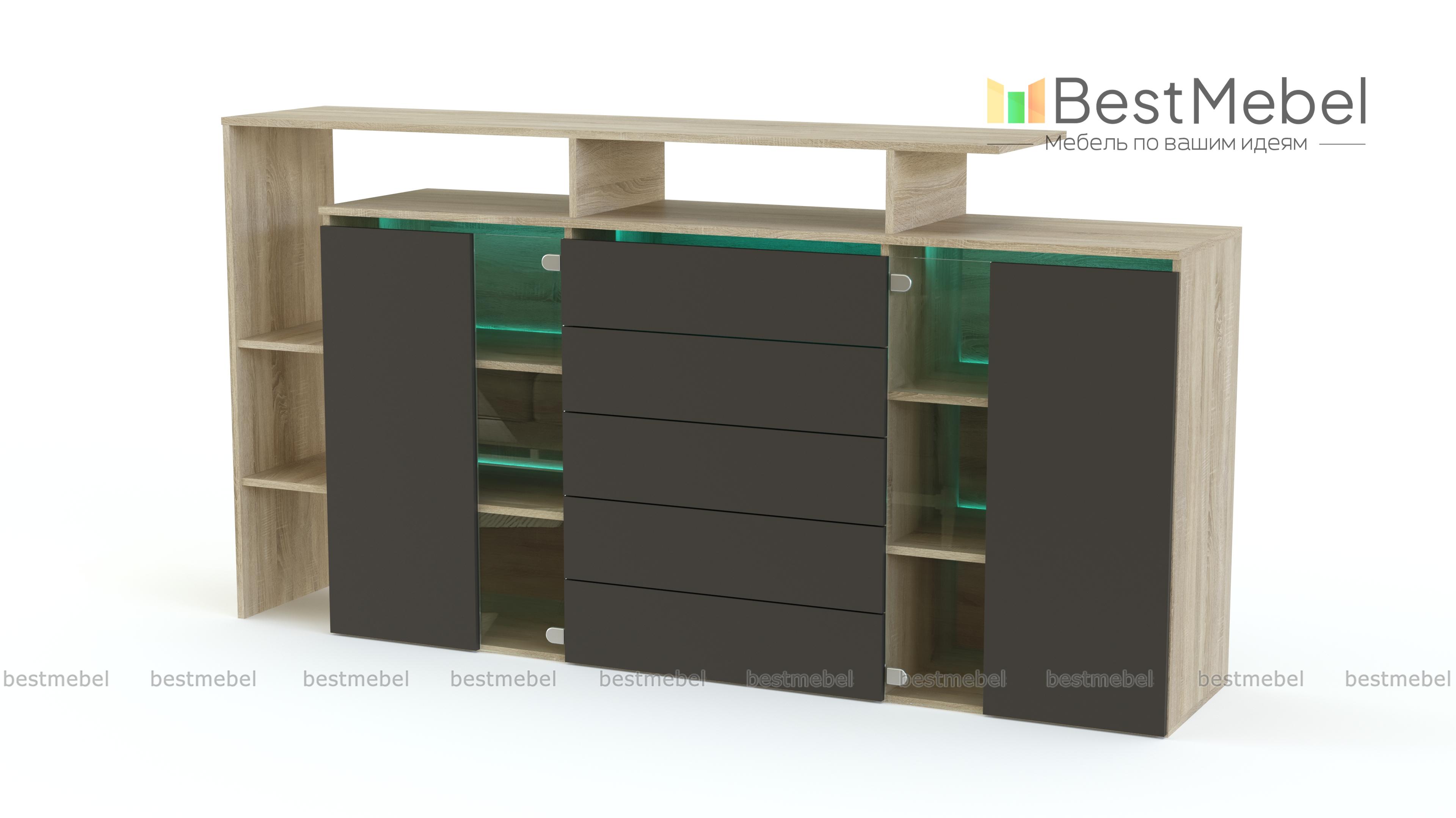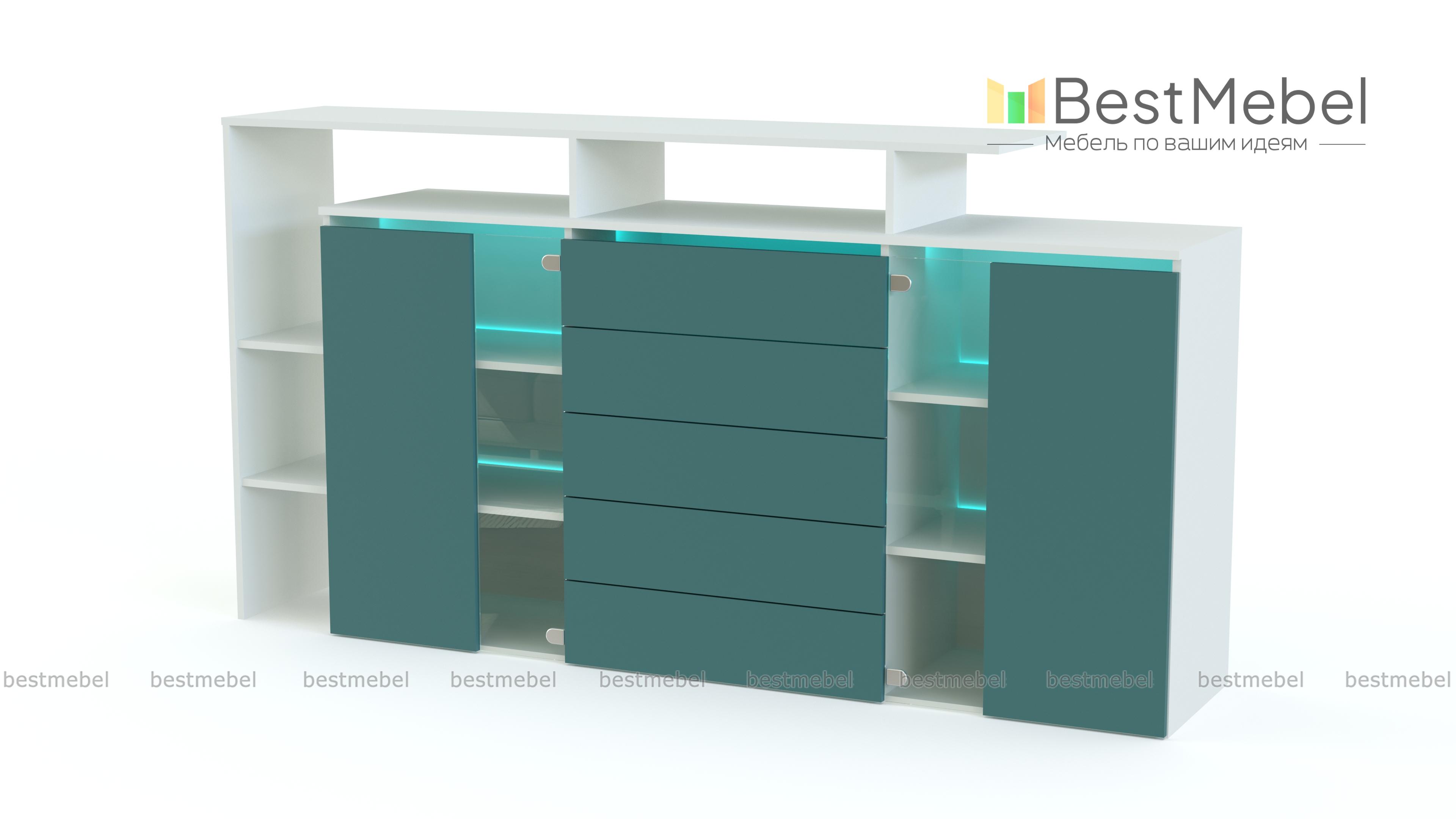 Стильная крупногабаритная модель Элит 74 BMS привлекает внимание не только оригинальным дизайном и смелой контрастной расцветкой, но и редкой функциональностью. Комод оснащен для хранения вещей не только просторными выдвижными отделениями, но и распашными. Легкость конструкции придают стеклянные дверцы и полностью открытые полки в боковой и верхней части. Матовые поверхности фасадов делают помещение зрительно больше. Отлично дополнит интерьер современной гостиной.
