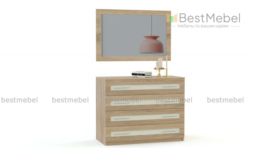Комод Карина 2.1 вайт BMS, дополненный навесным зеркалом с рамой в тон корпусу, станет практичным дополнением и элементом дизайна спального интерьера. Для удобного хранения одежды и домашнего текстиля предусмотрены четыре просторных выдвижных ящика, а на столешнице разместятся предметы декора. Классические рамочные фасады комода выполнены в натуральных древесных тонах со вставками белого цвета и двумя рядами ручек-рейлингов. Купить комод Карина 2.1 вайт BMS приглашаем в наш интернет-магазин, подобрав цвет и фурнитуру по каталогу.