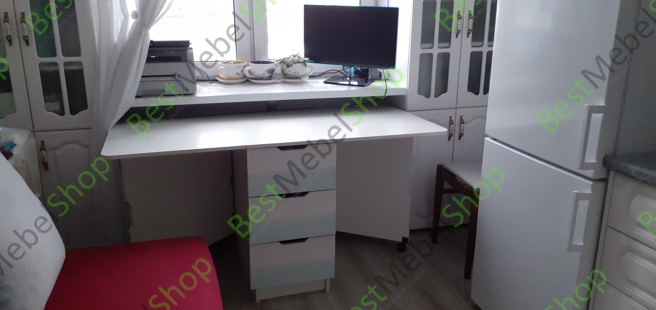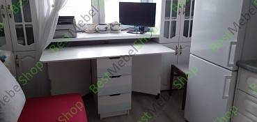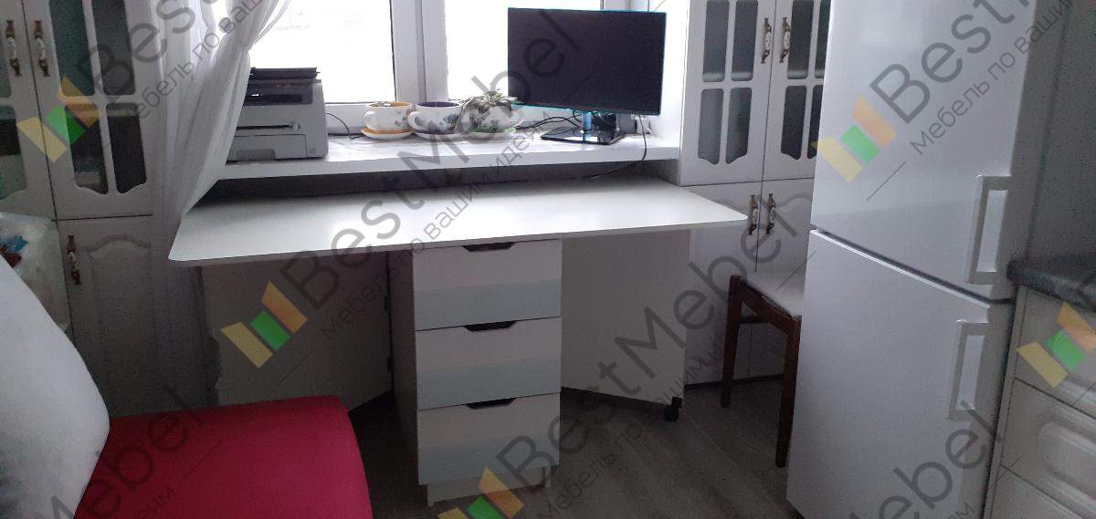 Стол для кухни был заказан по индивидуальным размерам. Замечательно "вписался" в отведённое пространство под подоконником. Легко трансформируется в тумбу. Можно переместить по кухне при необходимости.