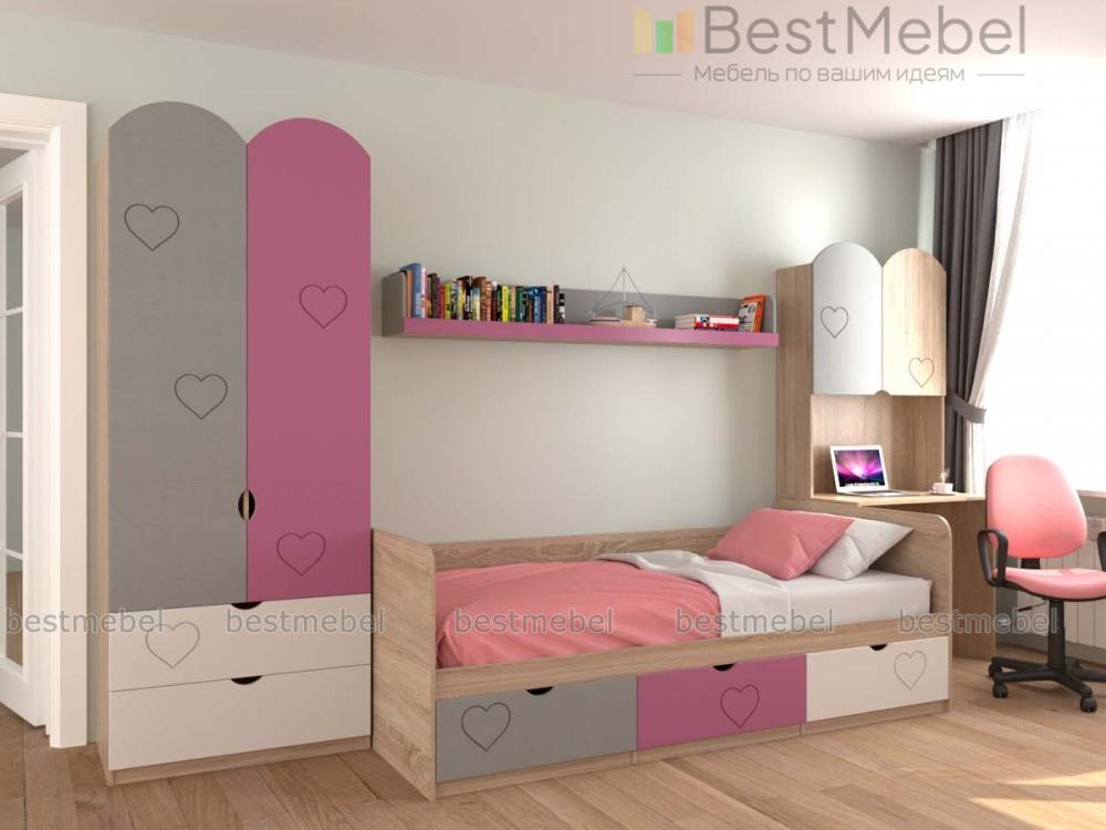 Детская комната Сказка 21 BMS оборудована всем самым необходимым для комфортного отдыха, учебы и хранения вещей ребенка. В комплекте кровать с тремя выдвижными ящиками для постельного белья или игрушек в основании, платяной шкаф и компьютерный стол с надстройкой в виде распашного шкафчика. Корпус древесного оттенка дополняют фасады в терракотовом цвете, украшенные фрезеровкой, дверцы фигурно вырезаны. Купить детскую комнату Сказка 21 BMS приглашаем в наш интернет-магазин.