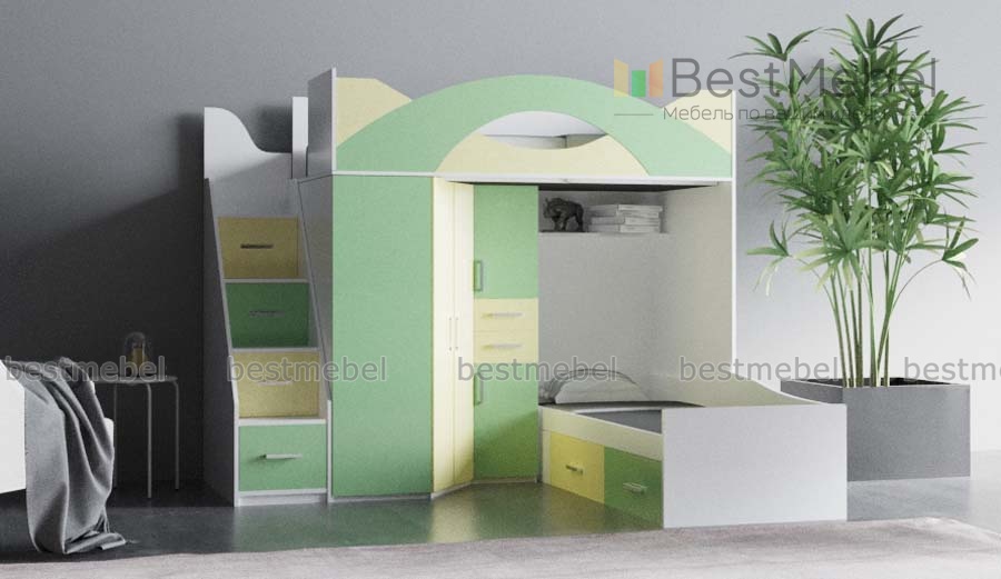 Двухъярусная кровать Мираж А-16 BMS будет по достоинству оценена детьми и их родителями. Практичный угловой вариант для небольших помещений включает в себя два спальных места – оборудованное защитным бортиком на втором и с выдвижными ящиками на первом, распашной шкаф для одежды, комбинированный пенал и лестницу-комод с ящиками для игрушек. В оформлении фасадов сочетаются фисташковый и желтый глянец с эффектом металлик. Купить двухъярусную кровать Мираж А-16 BMS приглашаем в наш интернет-магазин.