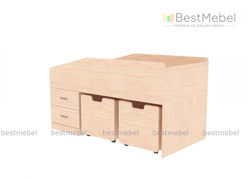 Кровать-чердак детская Миф-8 BMS отличается небольшой высотой и особенно удобна для малышей. Компактная модель в светлых древесных тонах объединила комфортное спальное место с высокими защитными бортиками и расположенные на первом ярусе выдвижные ящики, торцевые открытые полки и два вместительных выкатных ящика для игрушек. Продуманная конструкция обеспечит ребенку полноценный сон и поможет удобно разместить вещи. Купить кровать-чердак детскую Миф-8 BMS и эффективно использовать пространство вам поможет наш интернет-магазин.