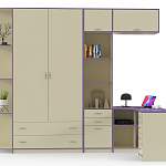Шкаф со столом Фиалка BMS выполнен в нейтральных бежевых тонах с фиолетовым кантом и будет гармоничным дополнением интерьера детской комнаты. В комплект входит все необходимое для хранения гардероба ребенка, размещения книг, игрушек, принадлежностей для школы и творчества. Платяной шкаф с торцевым стеллажом и ящиками в основании скомбинирован с колонкой, навесной полкой и угловым письменным столом с тумбами. Купить шкаф со столом Фиалка BMS приглашаем в наш интернет-магазин.