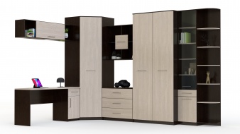 Шкаф угловой со столом Алиса-6 BMS объединил комфортное рабочее место и продуманную систему хранения. Композиция лаконичного современного дизайна включает в себя письменный стол с тумбой и навесной полкой, шкаф-трапецию для одежды, двухдверный платяной шкаф, застекленный и торцевой стеллажи и секцию с комодом и межсекционной полкой. Строгие линии предметов подчеркивает контрастное цветовое решение в древесных тонах. Купить шкаф угловой со столом Алиса-6 BMS для молодежной комнаты приглашаем в наш интернет-магазин.