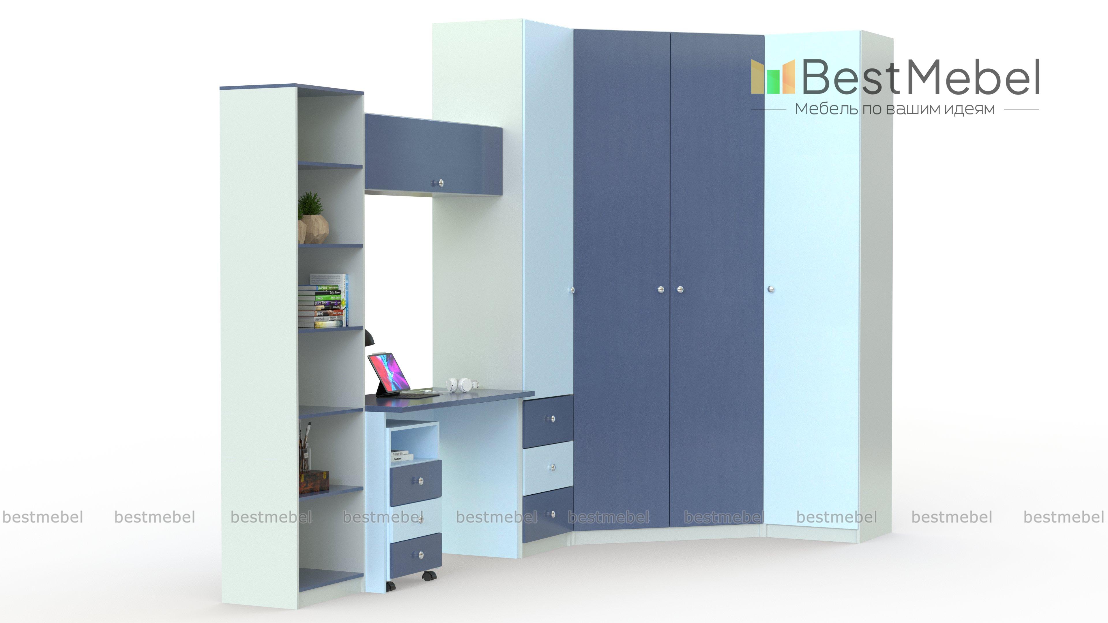 Шкаф угловой со столом Облако BMS с нежно-голубыми фасадами станет частью уютной современной детской. Угловая композиция поможет учесть особенности планировки и сделать интерьер комфортным и эргономичным. В комплекте письменный стол с мобильной тумбой, навесная закрытая полка, книжный стеллаж и распашные шкафы с полками, выдвижными ящиками и платяным отделением. Купить шкаф угловой со столом Облако BMS, который позволит легко поддерживать в комнате порядок, приглашаем в наш интернет-магазин.