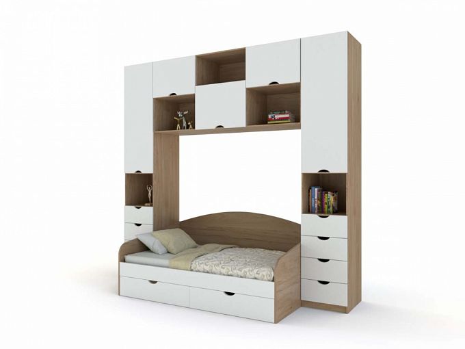 Стенка в детскую Ульяна с кроватью BMS поможет рационально использовать пространство малогабаритной комнаты. Практичная композиция объединила все необходимое для полноценного сна и хранения вещей ребенка, выгодно используя особенности планировки. В комплекте кровать-софа с бельевыми ящиками в основании, комбинированные пеналы, навесная книжная полка с открытыми и откидными секциями и угловой шкаф для одежды, дополненный торцевым стеллажом. Лаконичные по форме, предметы выполнены в актуальном сочетании древесных тонов и белого. Купить стенку в детскую Ульяна с кроватью BMS приглашаем в наш интернет-магазин.