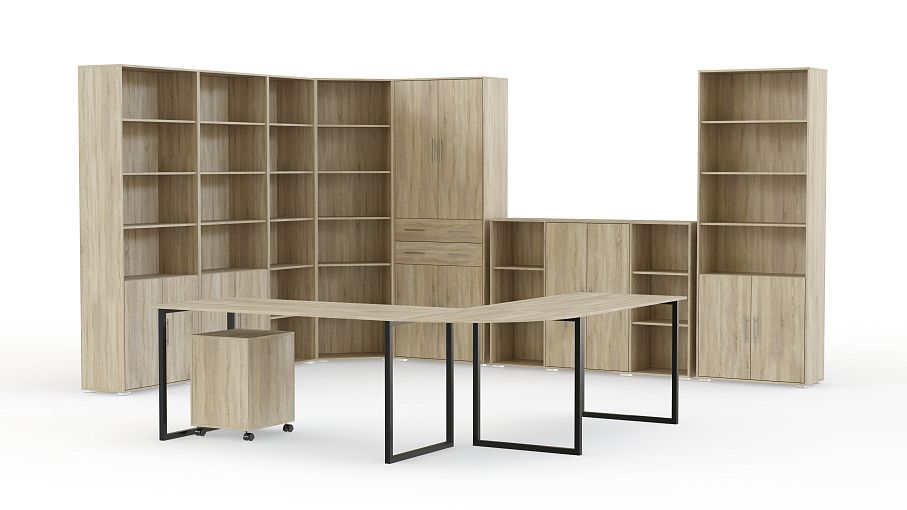 Просторный и стильный офисный комплект для руководителя. Мебель выполнена в теплых тонах и имеет фактуру благородного дуба. В многочисленных шкафах и стеллажах поместится все необходимое и даже больше. Здесь можно организовать небольшую библиотеку, разместить коллекционные предметы и многое другое. Так, чтобы ваш кабинет был не только практичным, но и передавал характер и увлечение владельца.