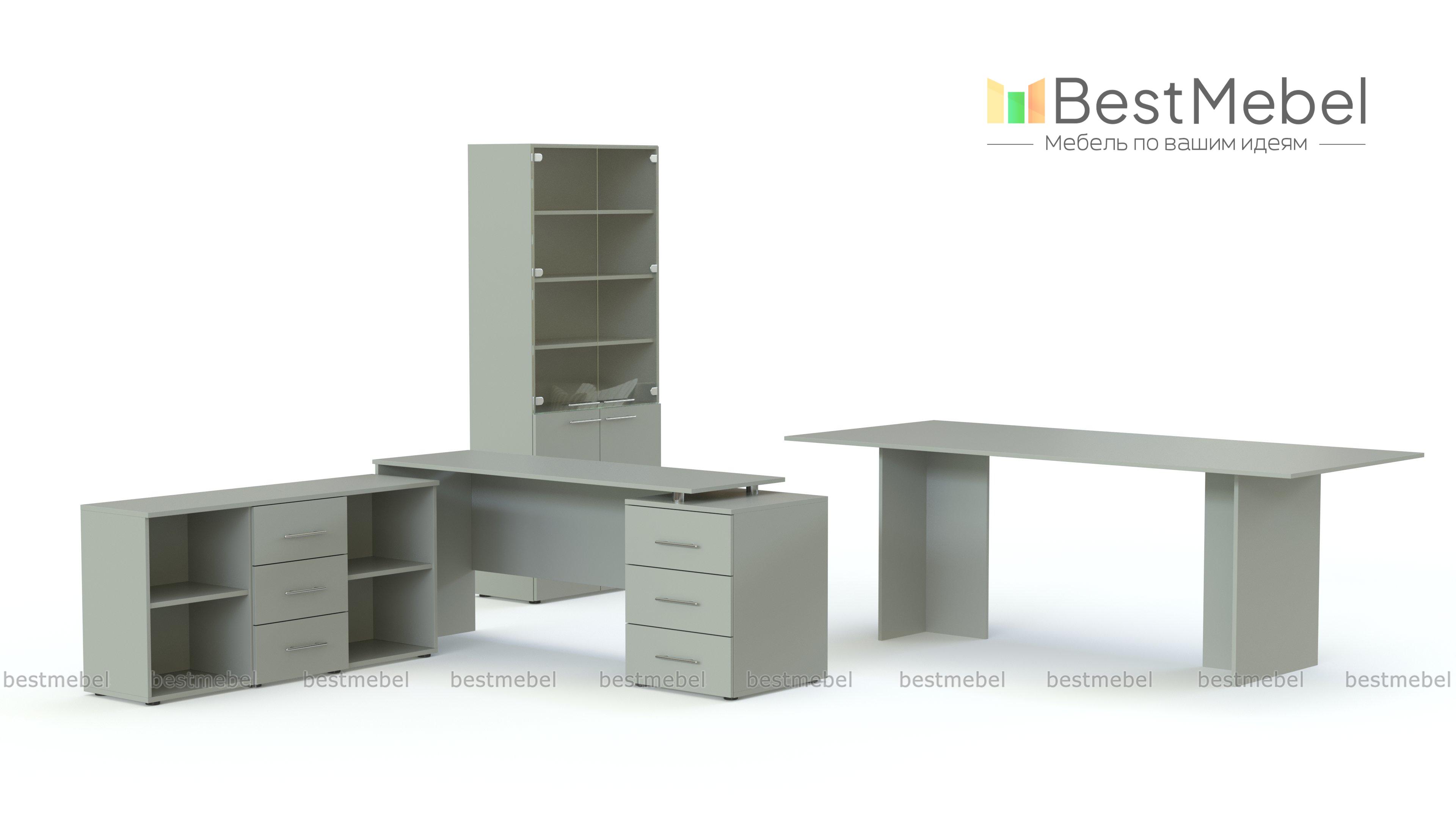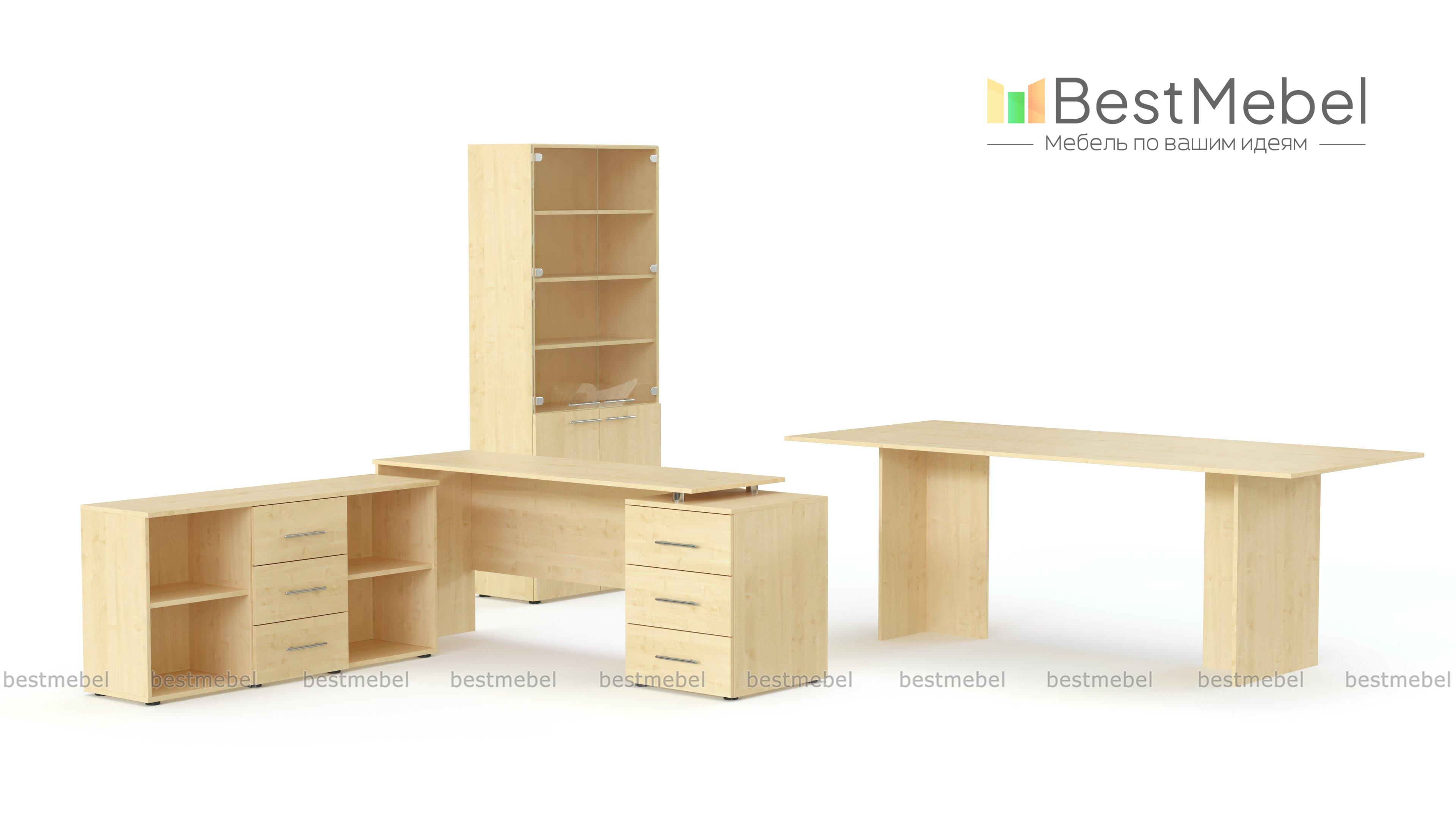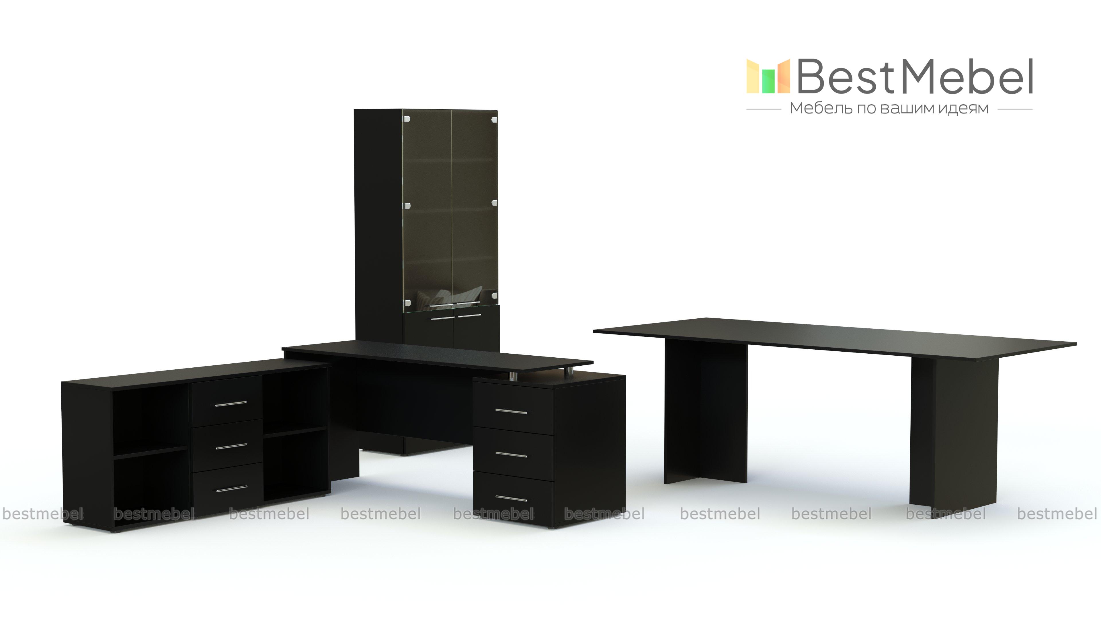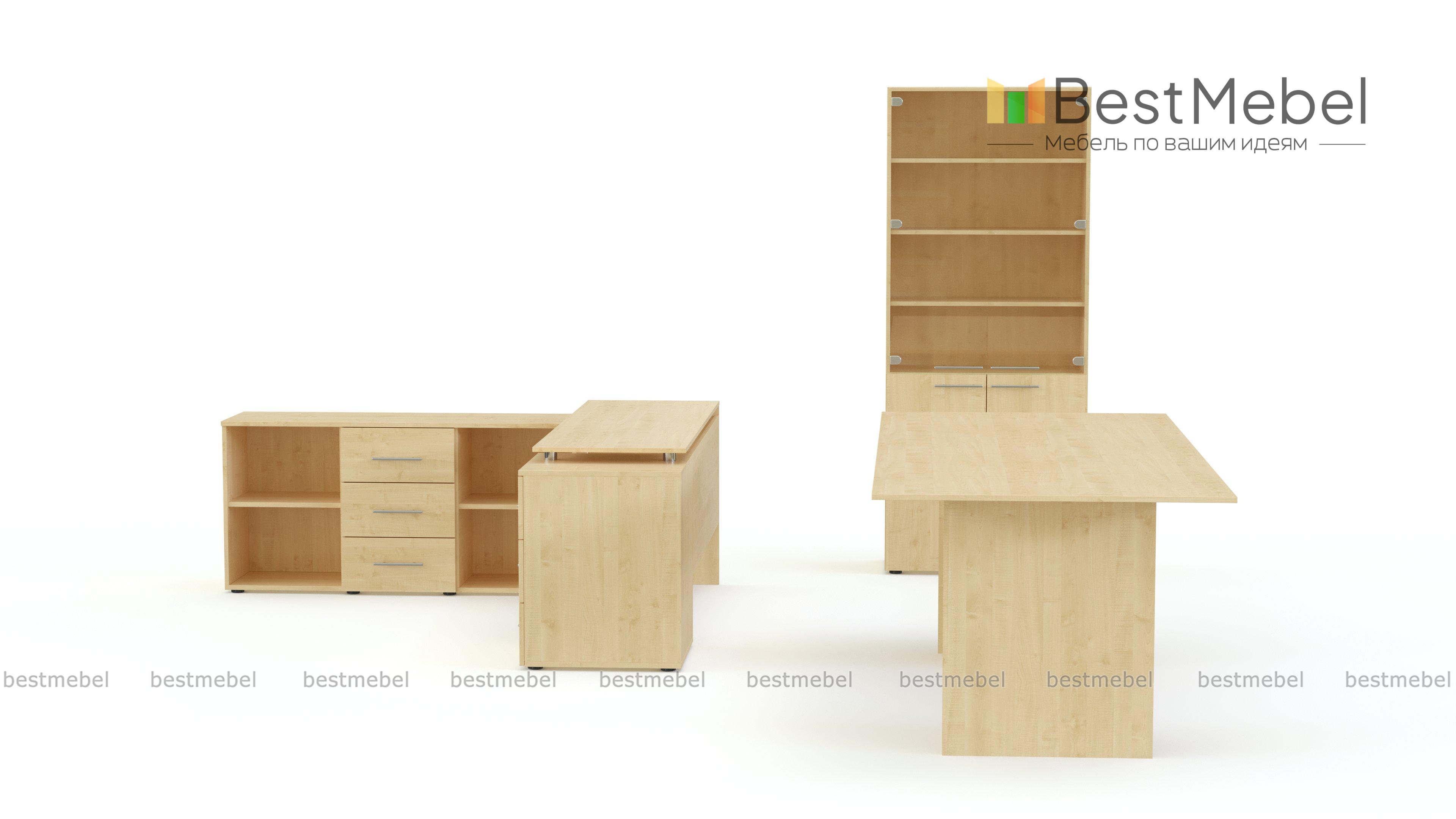 Небольшой, но вместительный кабинет для руководителя. Это вариант для тех, кто хочет организовать рабочее пространство и место для совещаний, не потратив на это много средств. В комплект входит стол, тумба, шкаф и конференц-стол. Никакой громоздкой мебели у Вас в кабинете, только простор для плодотворной работы. На выбор предлагается несколько классических цветов для оформления фасада и корпуса мебели.