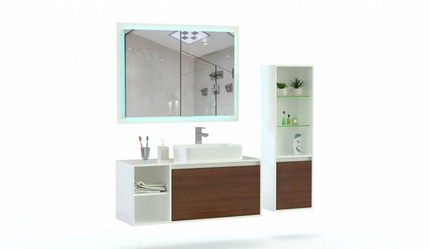 Комплект для ванной комнаты Оникс 4 BMS подходит для меблировки просторных помещений. В комплекте широкая подвесная тумба под накладную раковину-чашу, пенал со стеклополками и большое зеркало в раме, дополненное встроенной по периметру подсветкой. В оформлении предметов скомбинированы белый и теплые древесные тона, наличие глухих и открытых отделений делает хранение уходовых средств особенно удобным. Купить комплект для ванной комнаты Оникс 4 BMS приглашаем к нам в интернет-магазин.