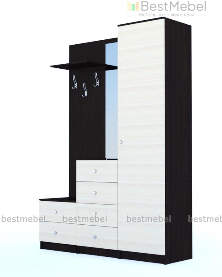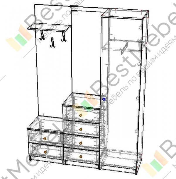 Очень оригинальная, современная и стильная модель, которая с порога подчеркнет Ваш вкус. Прихожая Фиерия состоит из трех уровневых блоков. Самый большой это одежный шкаф с полкой и штангой, средняя тумба – комод на четыре отделения, нижний уровень ‒ это тумба для обуви с двумя отделами. Основа прихожей представляет собой большое зеркало и открытую вешалку. Заказать такую мебель можно для дома или в современный, солидный офис, он везде будет украшением и долго и функционально служить.