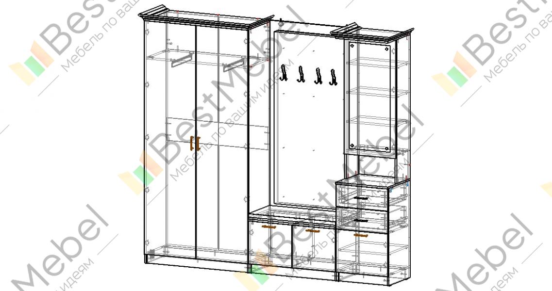 Прихожая Викос 2 BMS – элегантный модульный комплект для поклонников классического дизайна. Прихожая с карнизом выполнена в теплых древесных тонах, рамочные фасады декорированы фрезерованным рисунком и ручками под бронзу. Композиция включает в себя двухдверный шкаф для одежды, открытую вешалку в обивке из экокожи с каретной стяжкой, распашную обувницу с мягким сиденьем и тумбу с зеркальным шкафчиком. Купить прихожую Викос 2 BMS для уютного традиционного интерьера приглашаем в наш интернет-магазин.