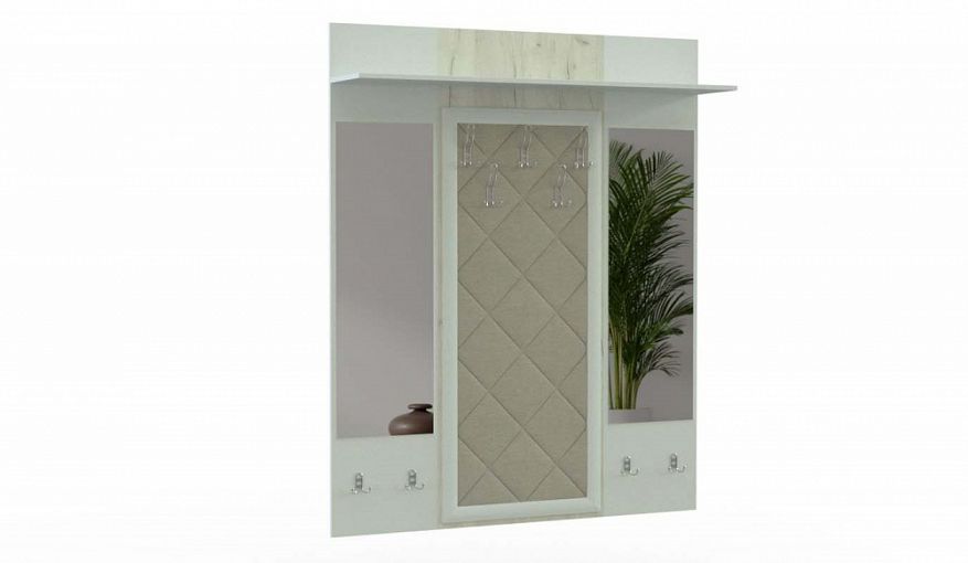 Вешалка Ева 1 BMS эффектно сочетает в оформлении ламинированные поверхности трендовых оттенков, мягкую обивку и зеркала. Визуально легкая навесная модель оборудована всем необходимым комфортной входной зоне. Простроченная ромбами панель с крючками для одежды и аксессуаров дополнена просторной верхней полкой под головные уборы и расположенными по бокам зеркалами и крючками для сумок. Купить вешалку Ева 1 BMS приглашаем к нам в интернет-магазин с выбором фурнитуры и цвета по каталогу.