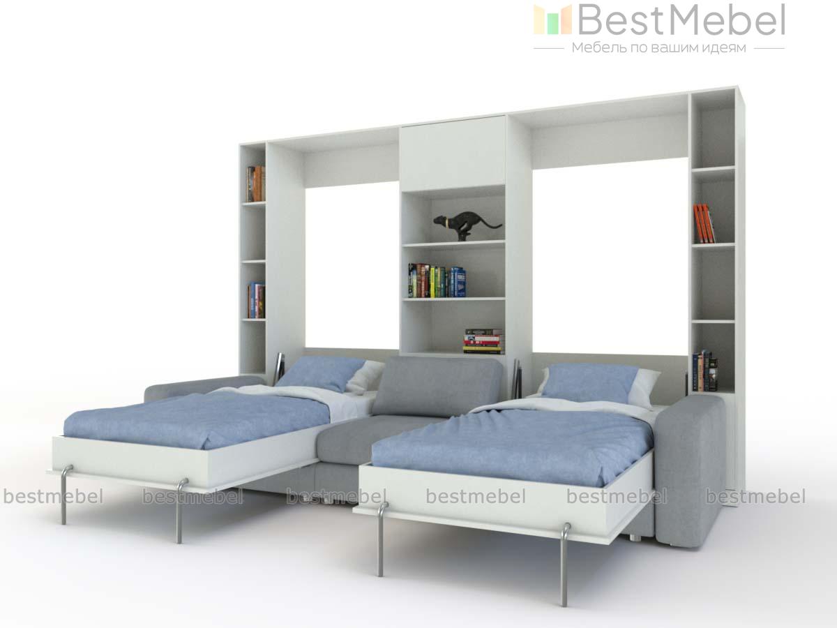 Шкаф-кровать с диваном Сара BMS станет практичным решением для молодежных и детских комнат. Композиция из шкафов с открытыми книжными полками и комфортного дивана поможет оптимизировать пространство и освободить центральную часть комнаты от лишней мебели. Две односпальных кровати скрыты за имитацией дверей и легко раскладываются при помощи надежного откидного механизма. Купить шкаф-кровать с диваном Сара BMS приглашаем в наш интернет-магазин, подобрав нужные параметры.