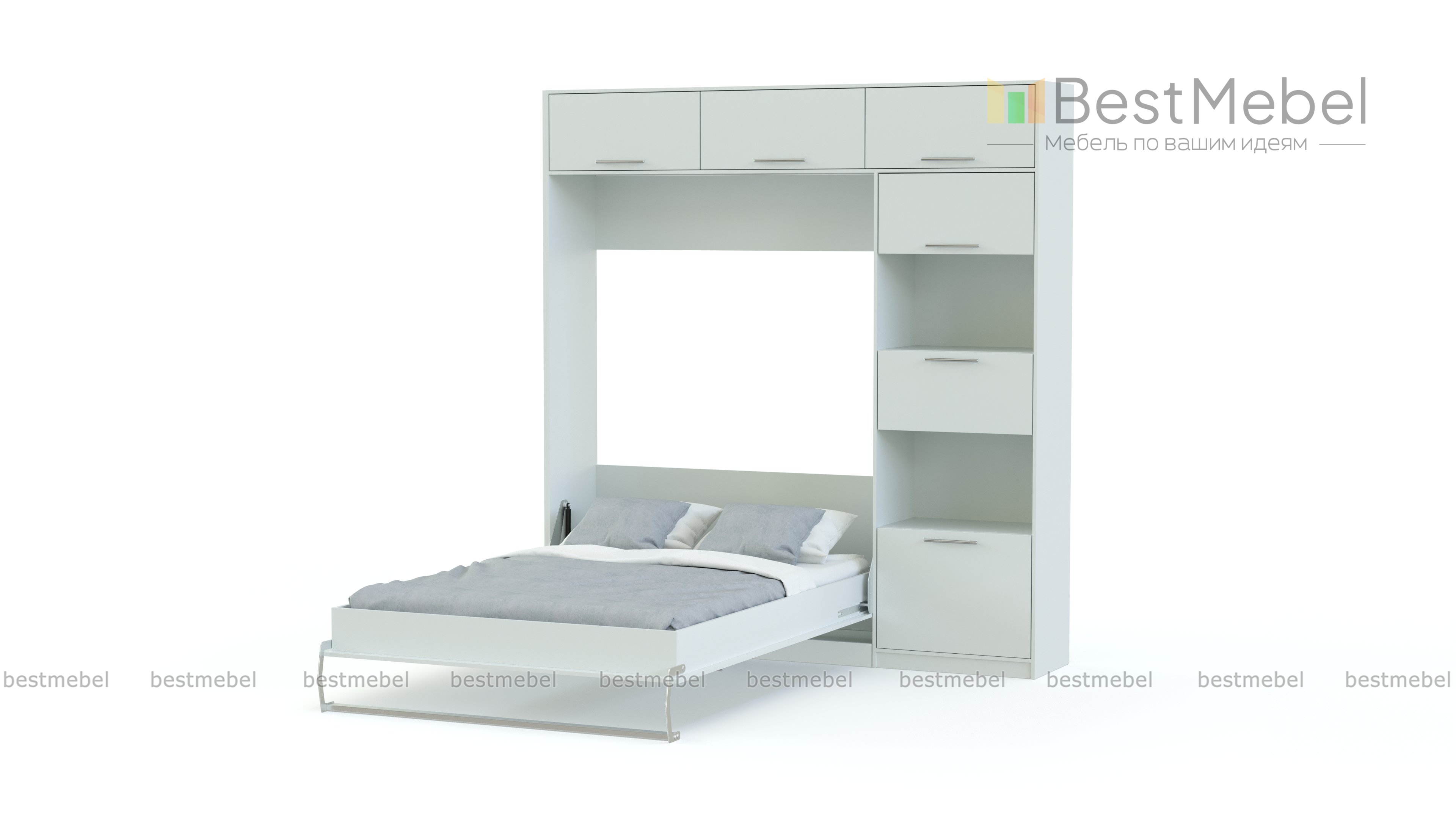 Шкаф-кровать трансформер Биг 2 BMS поможет вам создать комфортный и эргономичный интерьер в стиле минимализм. Эффектный шкаф с белоснежными корпусом и фасадами оборудован антресольными секциями с открывающимися верх дверцами, комбинированным пеналом и модулем-трансформером, который легко превратить в полноценную двуспальную кровать. Продуманная конструкция и компактные габариты композиции в сложенном виде позволят значительно сэкономить полезную площадь. Купить шкаф-кровать трансформер Биг 2 BMS приглашаем в наш интернет-магазин.