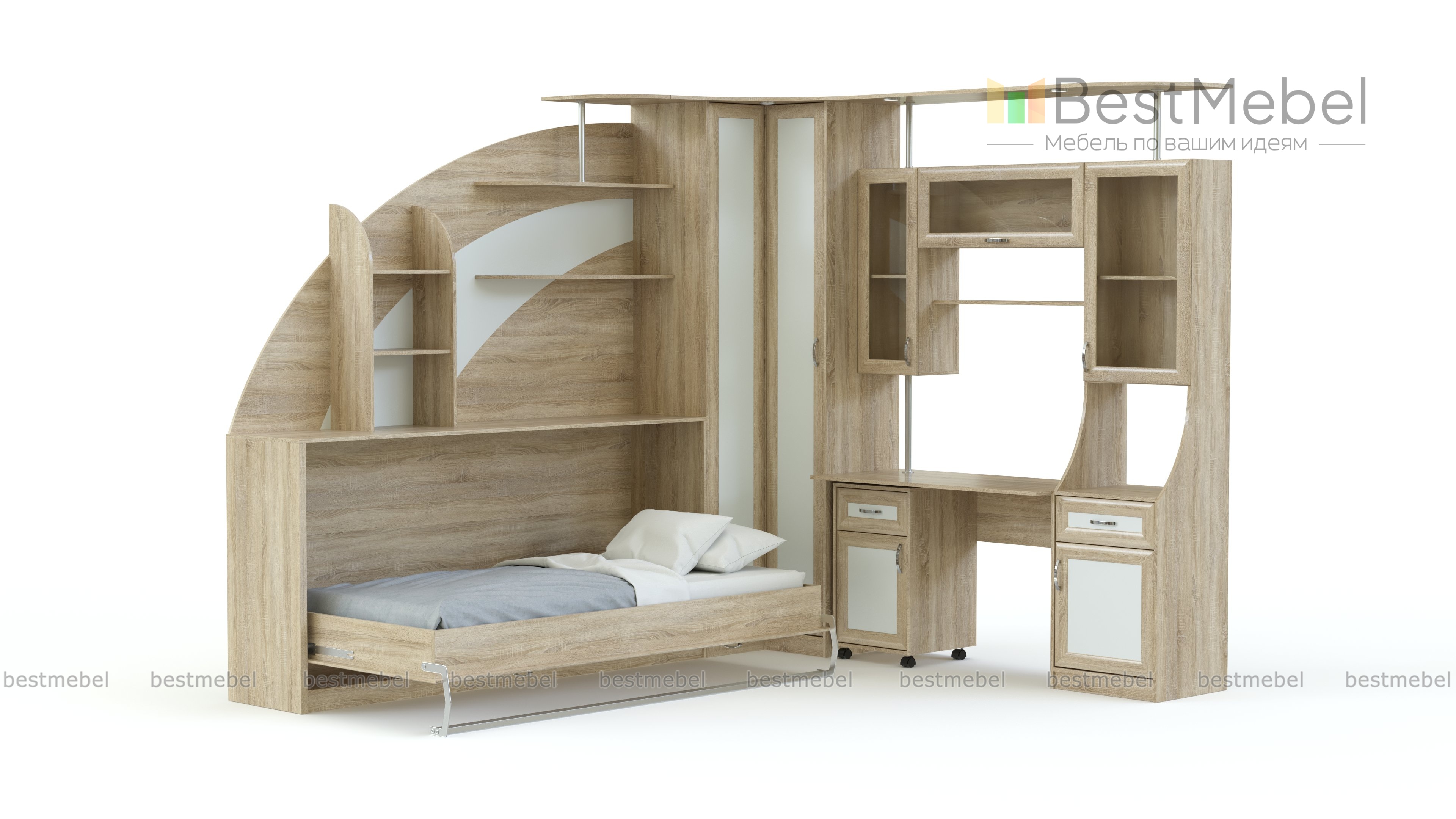 Шкаф-кровать трансформер Джули 33 BMS позволит оптимизировать пространство и вписать в интерьер малогабаритной комнаты все необходимое ребенку для полноценного отдыха, учебы и хранения вещей. Многофункциональная композиция включает в себя угловой шкаф для одежды, продуманную до мелочей рабочую зону и горизонтальный модуль-трансформер с откидной кроватью. Эффектный вид и легкость модели придают фигурно вырезанные элементы и множество открытых полок. Купить шкаф-кровать трансформер Джули 33 BMS вы сможете в нашем интернет-магазине.