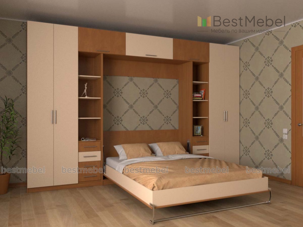 Шкаф-кровать трансформер Перу 22 BMS станет отличным выбором для владельцев малогабаритных квартир и студий. Современная стенка, оборудованная распашным шкафом для одежды, комбинированными с выдвижными ящиками стеллажами и антресолью, дополнена замаскированной под шкаф с зеркальным фасадом откидной кроватью. При помощи надежного вертикального механизма спальное место легко опускается вниз. Купить шкаф-кровать трансформер Перу 22 BMS и сэкономить пространство вам всегда поможет наш интернет-магазин.