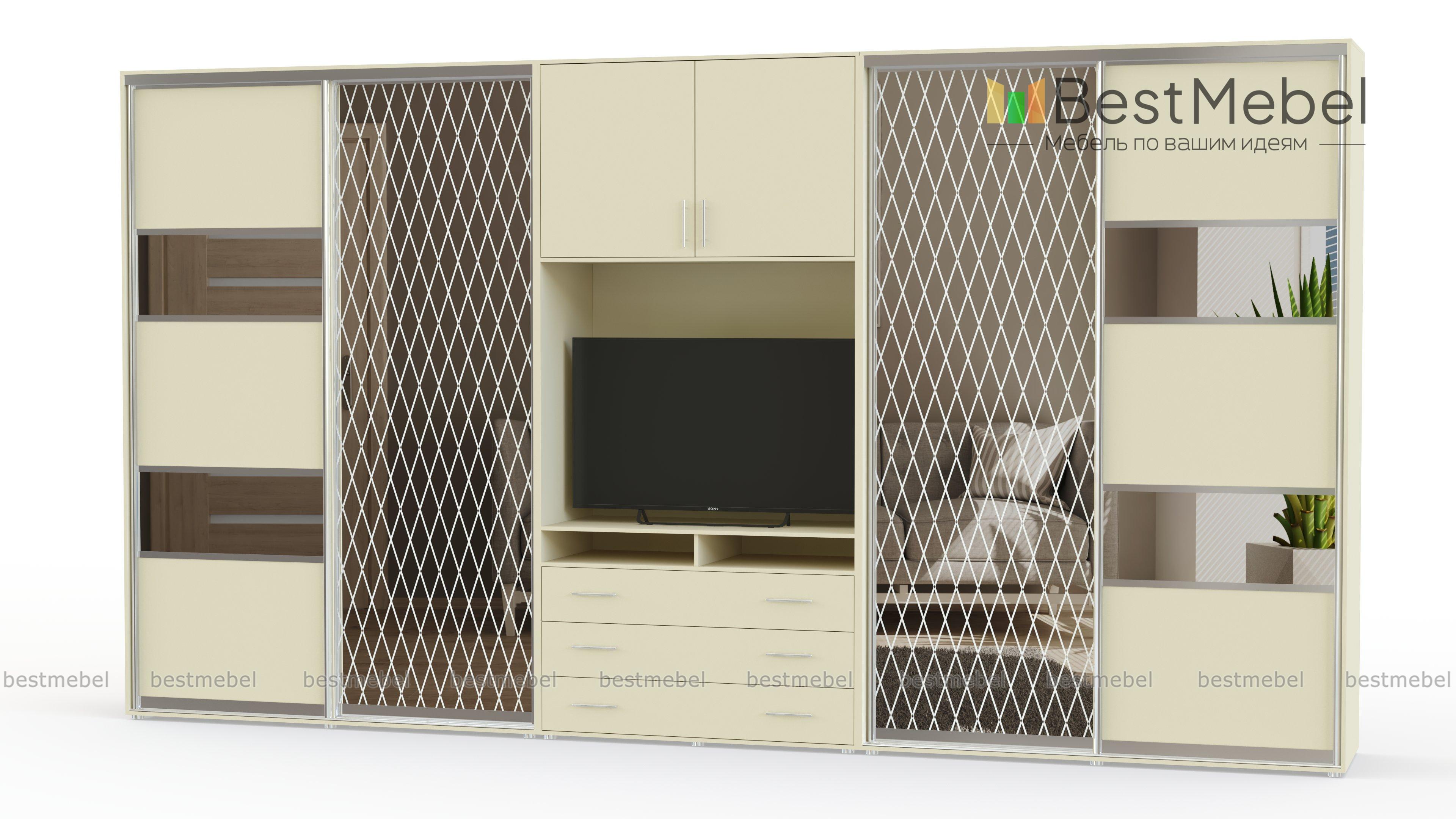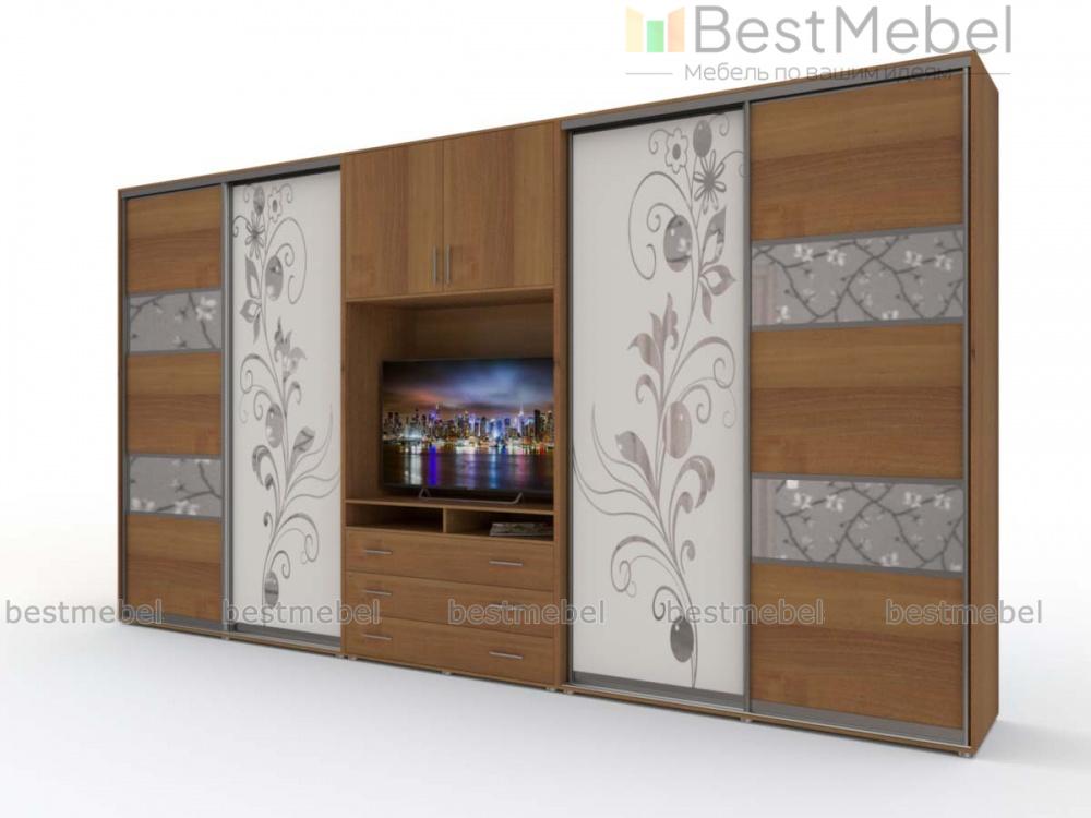 Двойной шкаф-купе Дора 10 BMS поможет вам компактно разместить большое количество вещей и оформить зону ТВ. Крупногабаритная модель объединила два двухдверных шкафа-купе с полками и штангами и расположенную в центре секцию с тумбой под аппаратуру, нишей и распашной глухой антресолью. Выполненная в теплых древесных тонах, композиция декорирована по фасаду зеркальными вставками, матовые дверцы украшает пескоструйный цветочный рисунок. Купить двойной шкаф-купе Дора 10 BMS приглашаем в наш интернет-магазин, подобрав оптимальные параметры.
