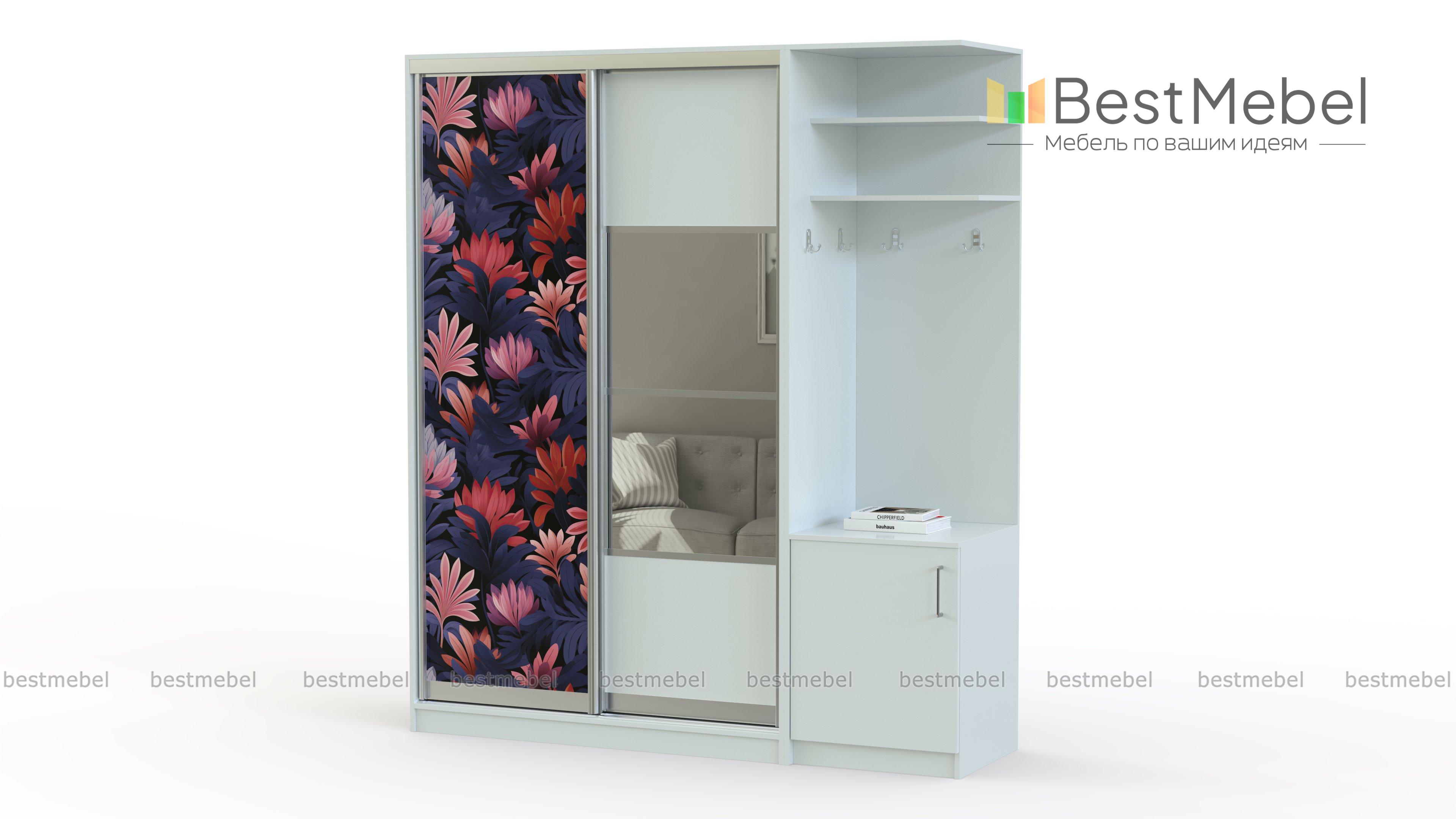 Шкаф-купе Франс 5 BMS сочетает в себе удобные средние габариты, практичность конструкции и оригинальный дизайн. Модель привлекает внимание эффектным дизайном фасада, в оформлении которого скомбинированы темные тона, зеркальная вставка и цветочная фотопечать. Бережно разместить всю необходимую одежду, обувь и аксессуары помогут просторное двухдверное отделение-купе и секция с открытой вешалкой, распашной тумбой и полками под головные уборы. Купить Шкаф-купе Франс 5 BMS по выгодной цене приглашаем в наш интернет-магазин.