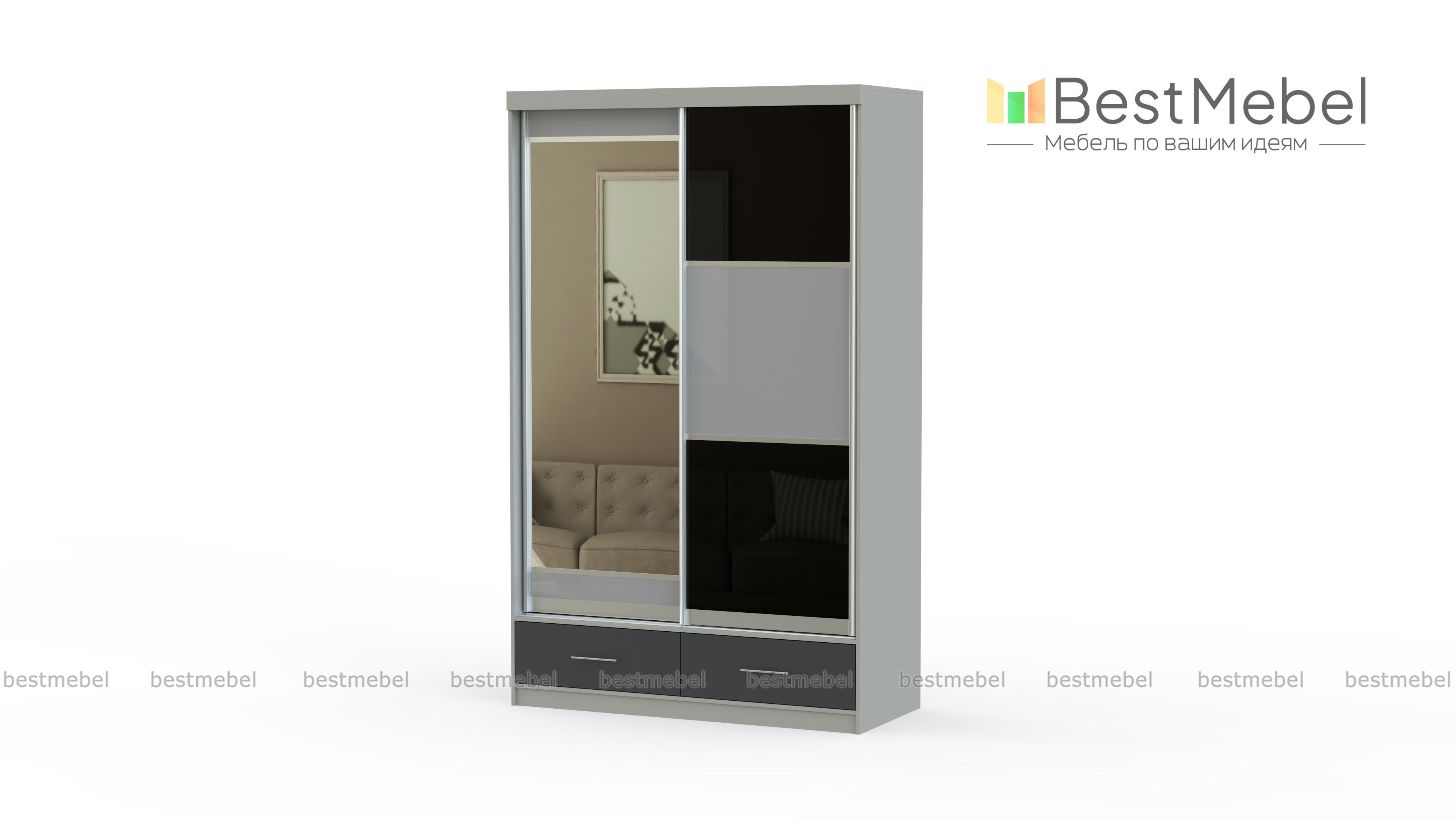 Внутреннее наполнение шкафа-купе – это 5 просторных ниш для Вашей одежды и обуви, 2 выдвижных ящика для мелочей, а также большое отделение со штангой для вешалок. Мы предлагаем варианты цветового оформления, доступные цены и услугу доставки, удобным для Вас способом.