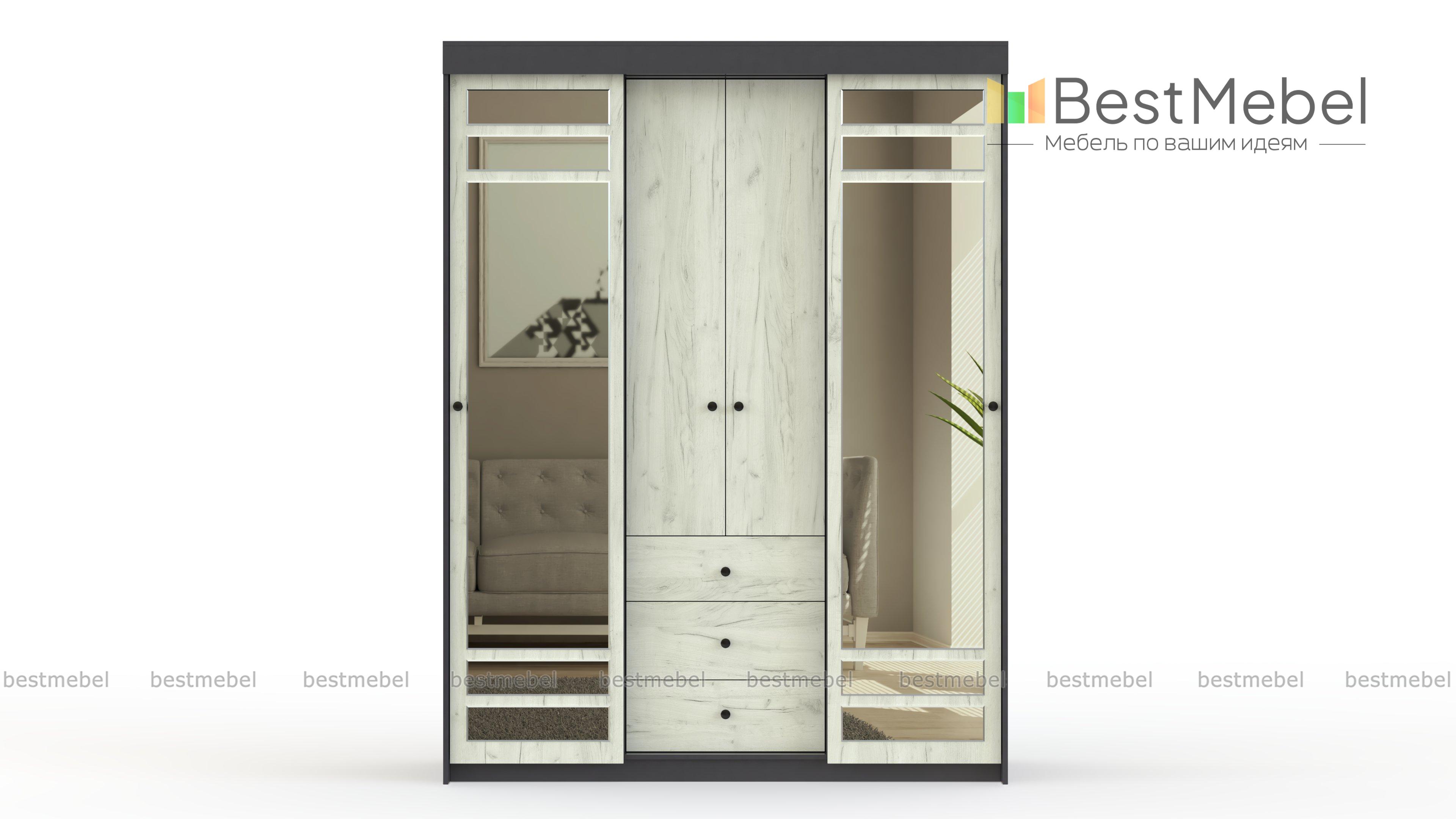 Шкаф-купе комби СВ-655 BMS выигрышно сочетает в себе разнотипные отделы для хранения разногабаритных вещей и принадлежностей. Здесь присутствуют классические распашные створки, раздвижные дверки, удобные вместительные выдвижные ящики. Вмещая в своё объёмное внутреннее пространство большое количество вещей, шкаф экономно и органично вливается в маленькое помещение. Вас не оставит равнодушными зеркальные вставки и идеально гармонирующие контрастные оттенки. Безупречной эксплуатации не помешает даже фурнитура, потому что она выполнена из проверенных временем материалов и надёжно крепится. Купить по низкой цене шкаф-купе комби СВ-655 BMS можно очень быстро в нашем магазине.