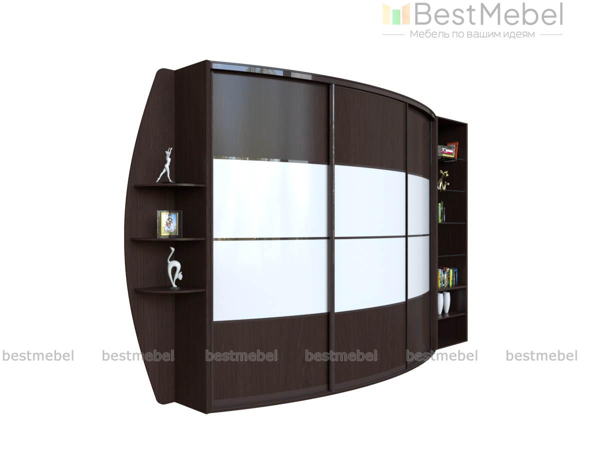 Шкаф радиусный Арома 1 BMS – нестандартное стилевое решение и удобная система хранения для просторной современной спальни или гостиной. Прямая трехдверная модель с чуть выпуклым радиусным фасадом дополнена книжным стеллажом и торцевыми полками на эффектно скругленной панели. Крупногабаритная конструкция без труда разместит гардероб и выигрышно представит книги и интерьерные украшения. Выполненный в темном древесном оттенке венге, шкаф декорирован белыми вставками. Купить Шкаф радиусный Арома 1 BMS выгодно приглашаем в наш интернет-магазин.