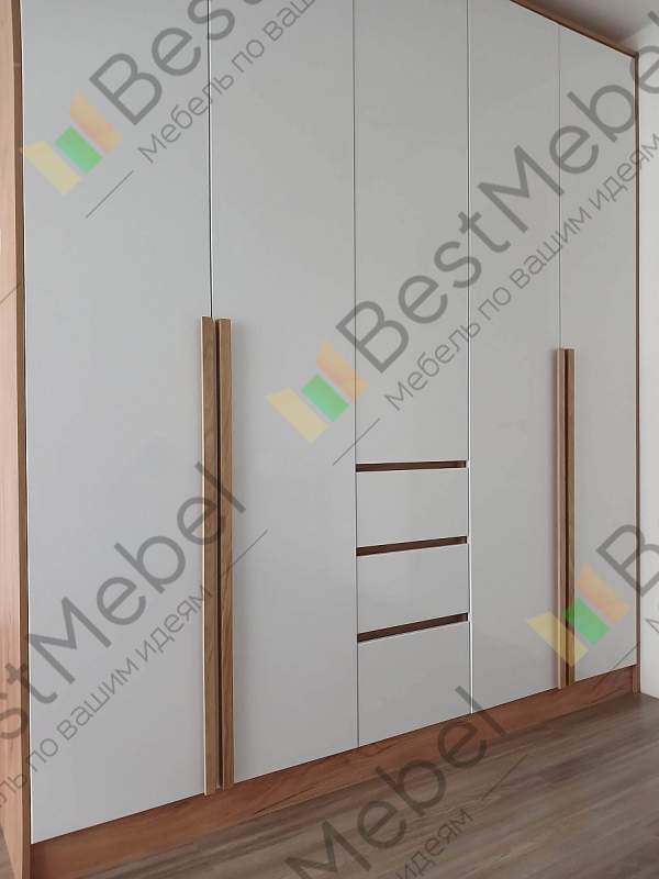 Шкаф очень красивый, дверцы с фаской, выглядит стильно. Удобный - если брать петли с доводчиком. Единственный недостаток проекта - ручки дверей, 120 см, это просто палка из лдсп, установленная ребром на фасад, с кромкой по внешней стороне, выглядит хлипко и установлена только на половине дверей, неудобная и непрактичная идея, поэтому сразу заменили на г-ручки из массива дуба - и за эти лдсп минус звезда в качестве. И, пожалуй, сейчас я бы взяла ещё и две дополнительные полки в широкие отделения, свободное место для них там есть. Заказывали на 25 см уже стандарта. Всё сделали быстро. Изготовили за неделю - привезли в спб сразу, в течение недели довезли фурнитуру и забытые фасады ящиков. Ничего не было побито, упакован очень хорошо. Сборщика от магазина пришлось подождать, но не пожалели, что не собирали сами - некоторые присадочные для саморезов петель были не там, а местами соединения было невозможно реализовать из-за ракурса сборки - уголки по факту заменили на дополнительные конфирматы.
