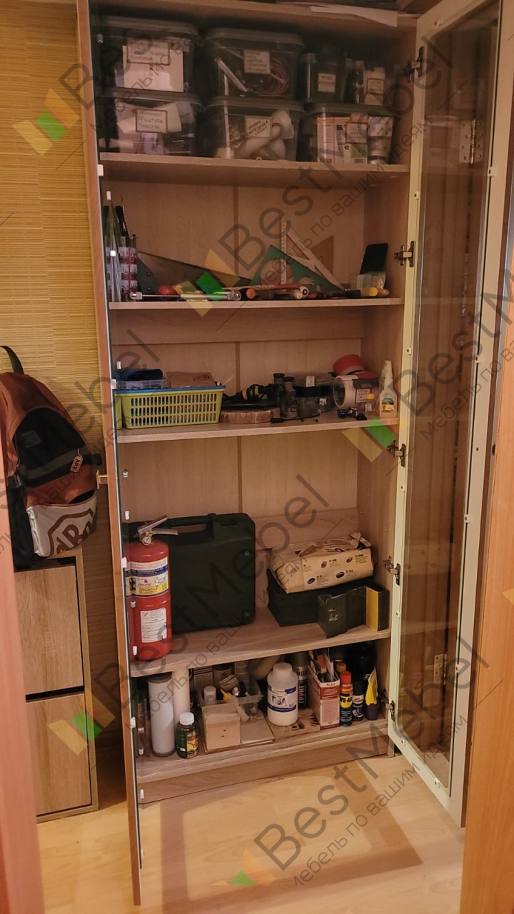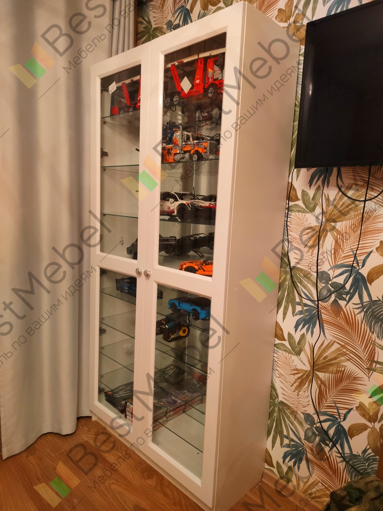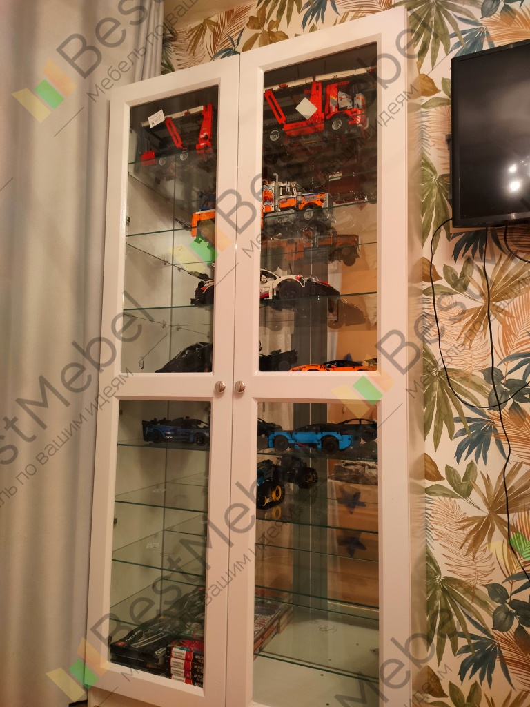 Изменяли размеры для себя, изготовили в срок. Собираться легко, использовали дополнительно шуруповерт и молоток. Стекла обычные, боялись разбить, но получилось собрать без инцидентов. Смотрится хорошо. Из минусов - есть косяк на зней панели, но мы заставили его коробками и не видно. Полки не скрытого крепления, поэтому на стенках шкафа остаются видны саморезы (или как они называются), которые заклеиваются наклейками. Но наклейки все-равно хорошо вины, что немного портит внешний вид