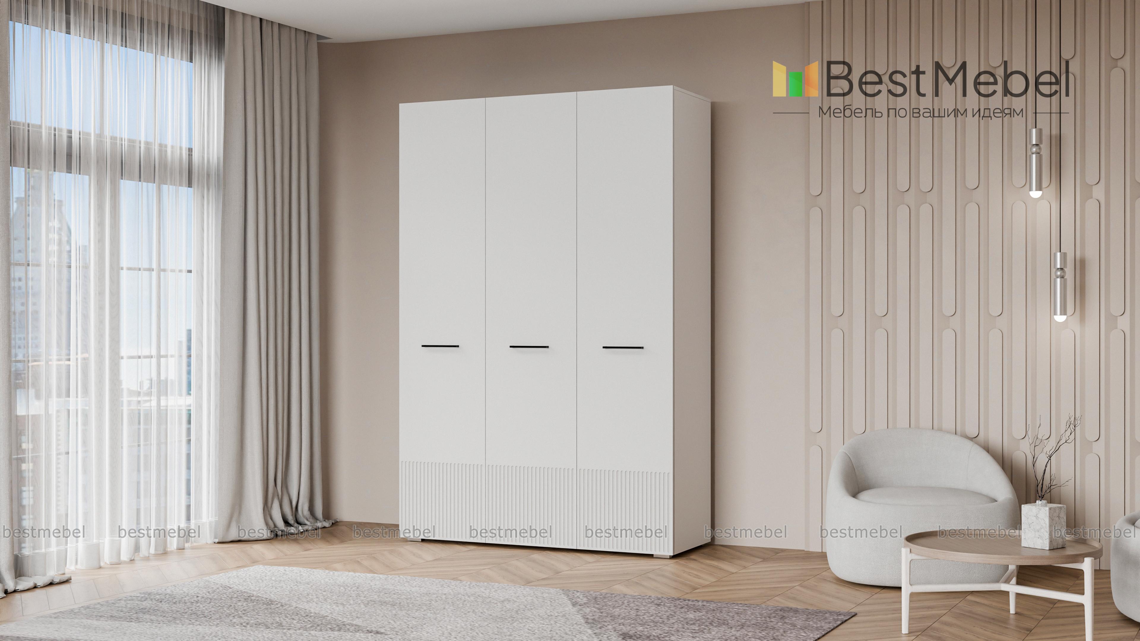 Шкаф распашной Декарт 3 BMS сохранит порядок в спальне, детской комнате или входной зоне. За двумя дверцами справа скрыта штанга для одежды, а однодверное отделение слева оборудовано полками. Элегантный фасад с рельефом и оригинальными ручками-скобами хорошо сочетается с разными интерьерами, помогая создать гармоничную обстановку. Купить шкаф распашной Декарт 3 BMS вы сможете в нашем интернет-магазине, самостоятельно подобрав размеры, цвет и наполнение.