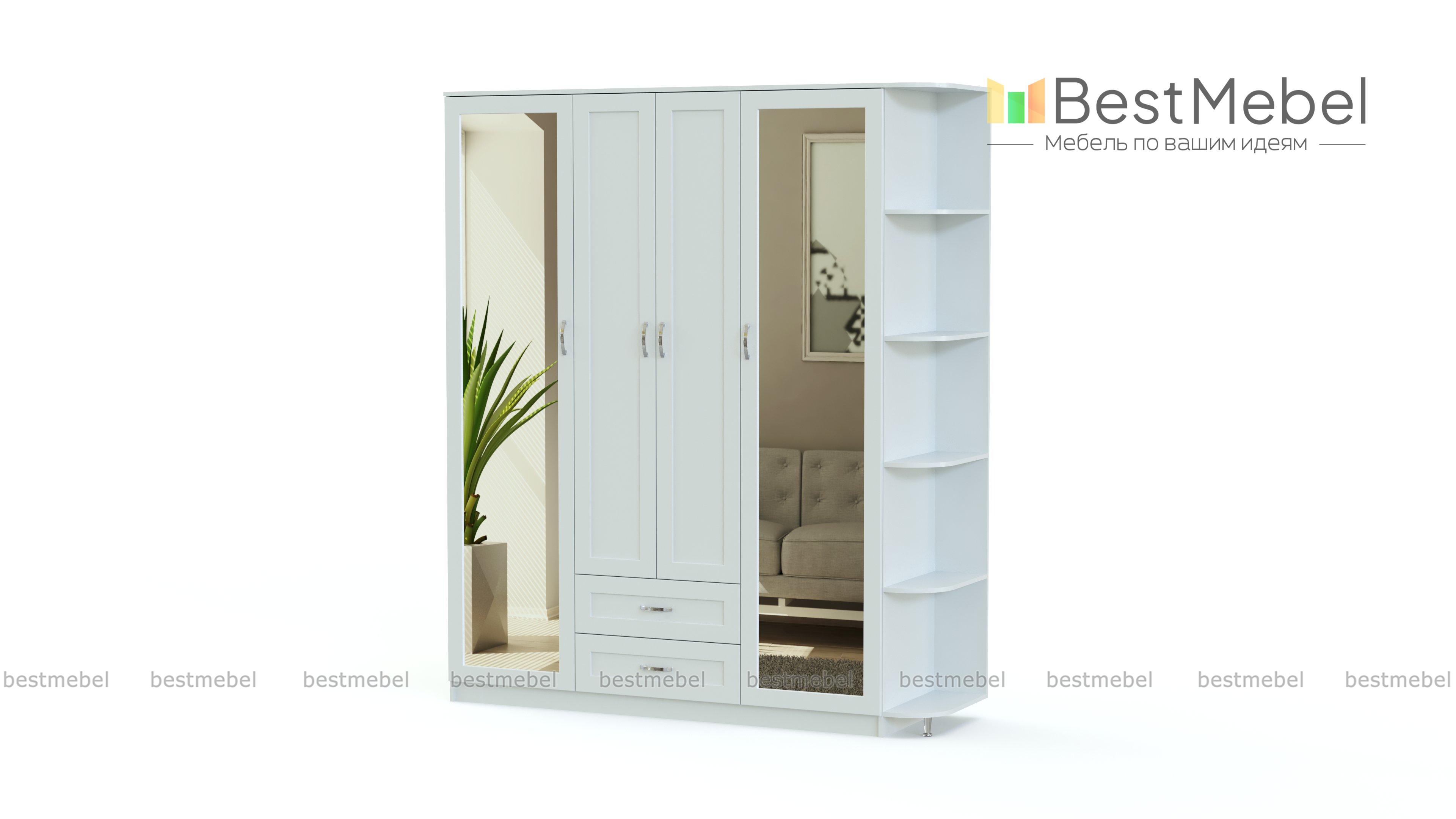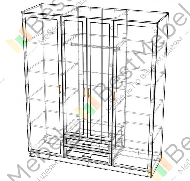 Довольно большая и вместительная модель в классическом стиле. Распашной шкаф Вернисаж представляет собой шкаф из трех частей: боковые части с полками и средняя часть со штангой под одежду на плечиках и с полкой для шляп. Кроме этого, в средней части имеются два выдвижных ящика для нижнего белья. Большие зеркала на дверках шкафа и угловой элемент с декоративными полками делает модель привлекательной. Купить данную мебель можно для спальни, прихожей или коридора.