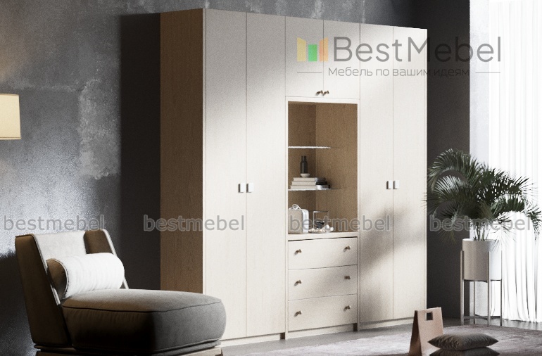 Распашной шкаф Акест Т2 BMS – модель, которая поможет оборудовать как просторную спальню, так и гостиную. Крупногабаритный комплект выполнен в универсальных светлых тонах и представляет собой гармоничное сочетание двухдверных шкафов со штангой и полками и центральной секции, оборудованной тремя выдвижными ящиками, стеклянными открытыми полками и распашным отделением. Лаконичная по форме, модель декорирована оригинальными квадратными ручками. Купить распашной шкаф Акест Т2 BMS приглашаем в наш интернет-магазин.