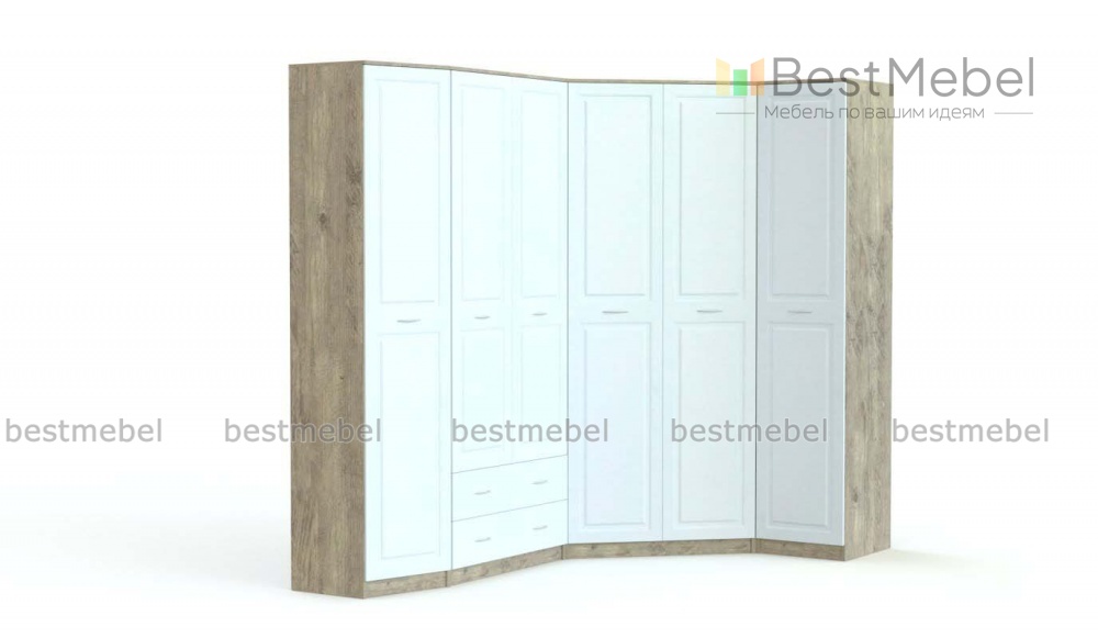 Шкаф угловой Браво К 3 BMS поможет вам выгодно использовать особенности планировки и компактно разместить большое количество вещей. Композиция включает в себя угловой двухдверный модуль, два пенала – прямой и со скошенным фасадом, а также комбинированный шкаф с выдвижными ящиками. Сочетание натуральных тонов с имитацией текстуры дерева и белого с фрезеровкой создает элегантный современный дизайн. Купить шкаф угловой Браво К 3 BMS для меблировки спальни вы сможете на сайте нашего интернет-магазина.