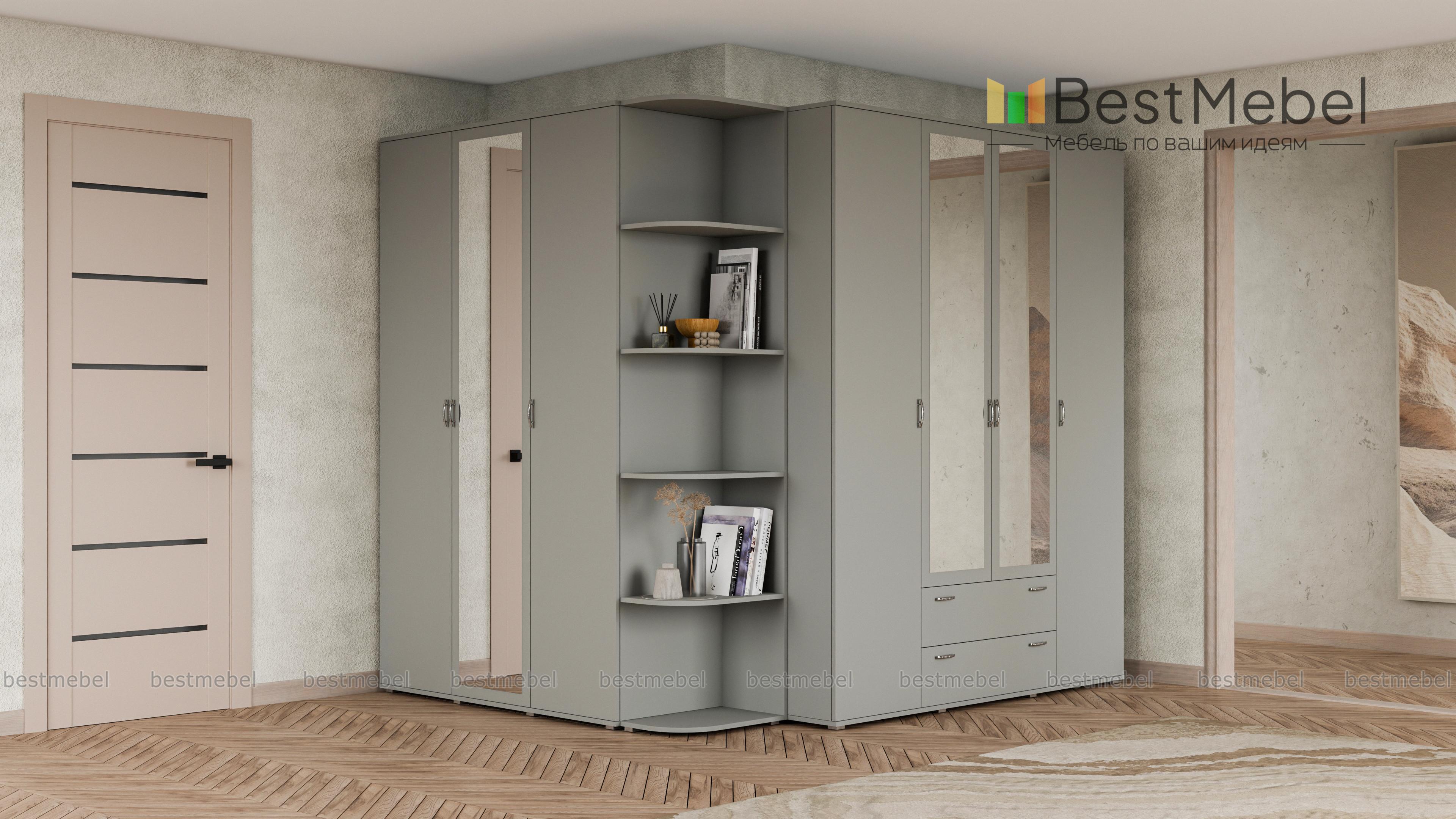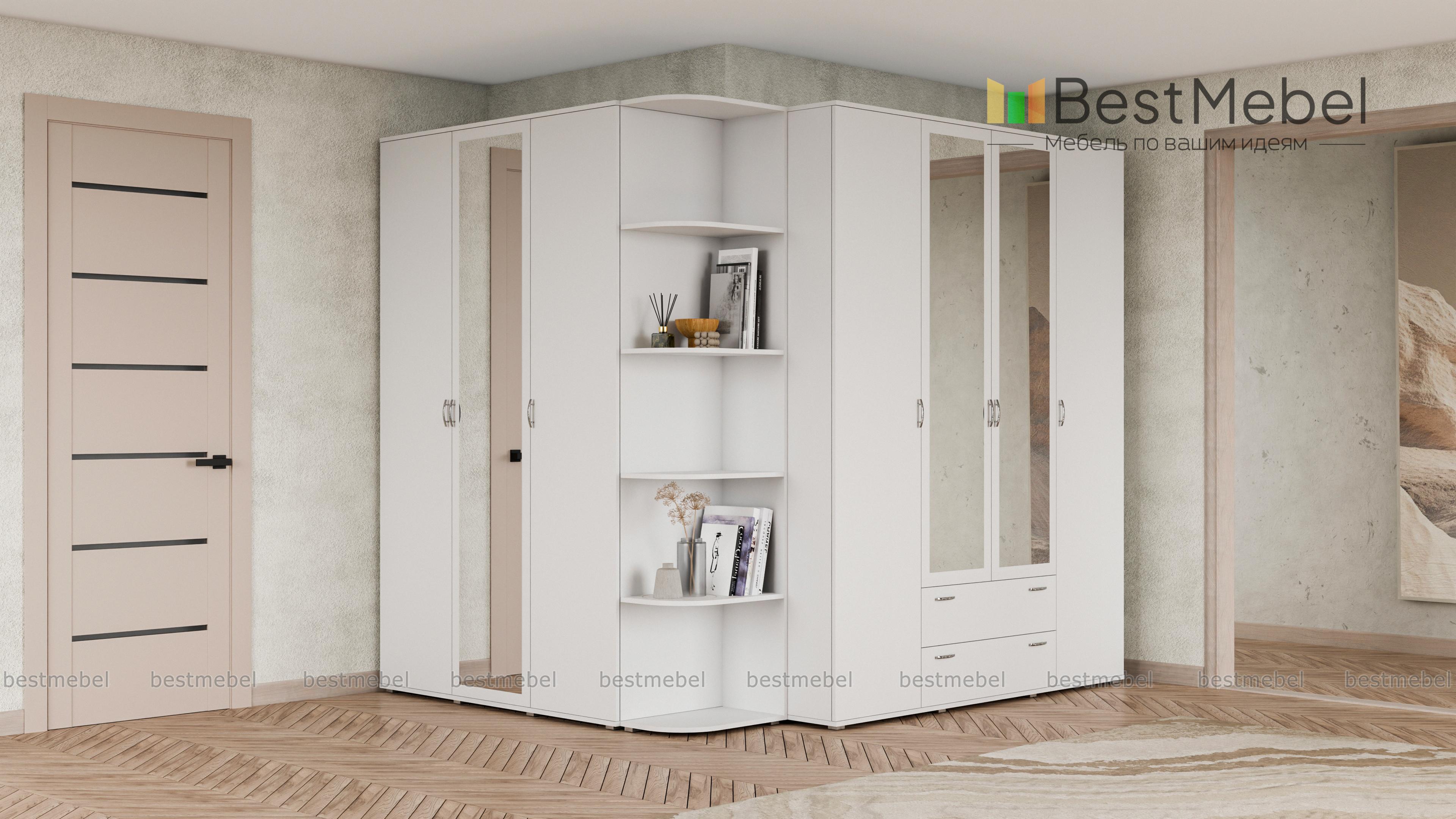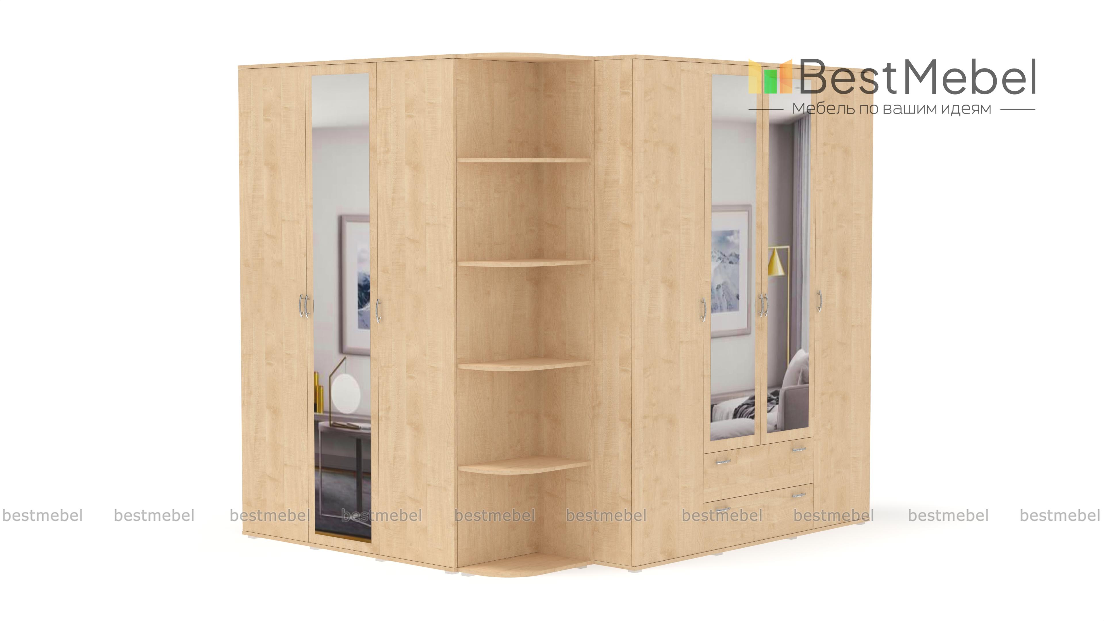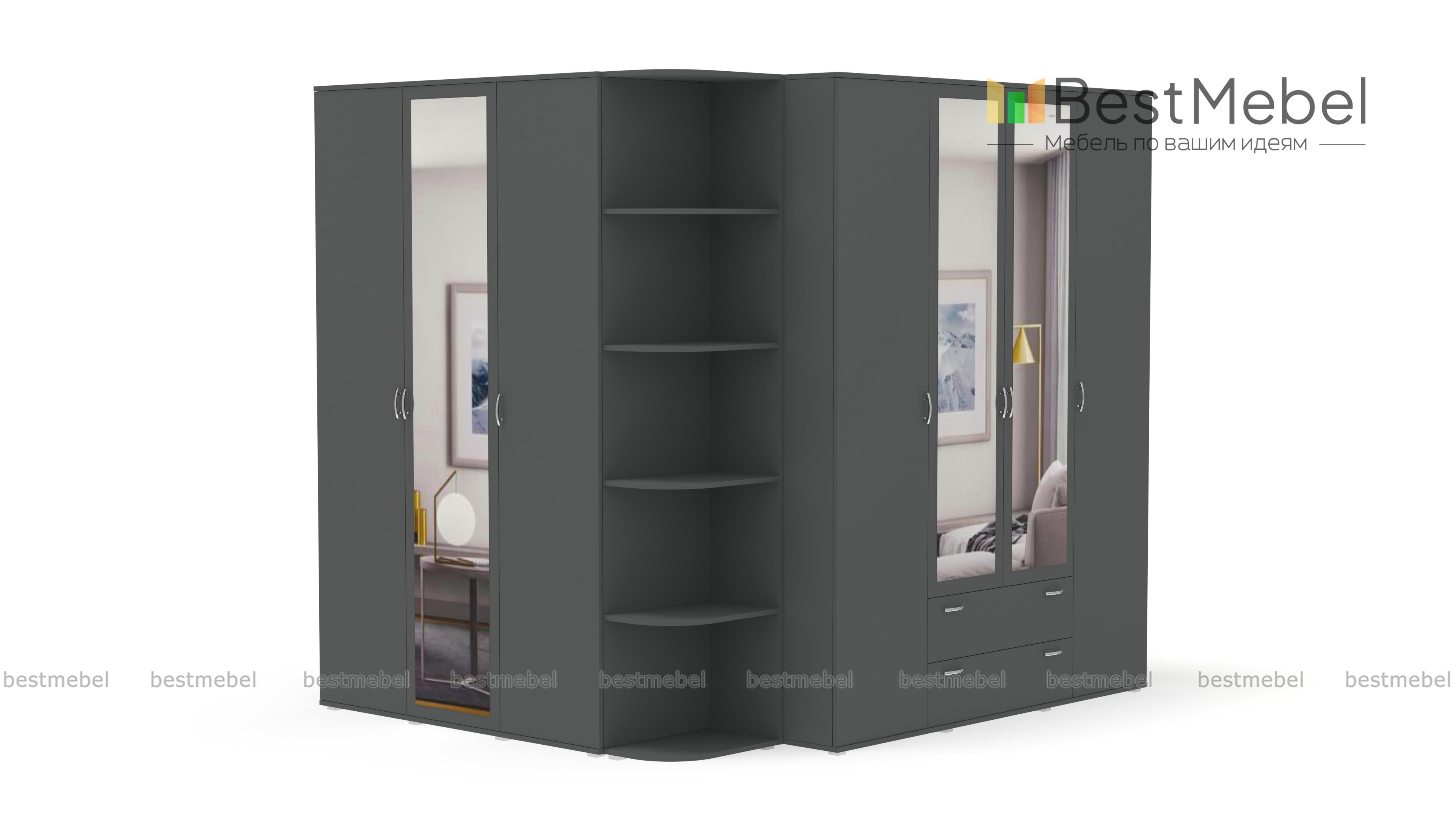 Шкафы Лотос отличаются вместительностью и практичностью. Угловая комплектация прекрасно впишется в интерьер с соответствующей геометрией. Состоит из трех секций. Модуль с тремя дверьми, центральная с зеркалом. Угловой стеллаж. Шкаф с четырьмя дверьми, две из которых зеркальные, и ящиками. Комплектуется штангами, выдвижными ящиками, полками. Внутреннее пространство подходит для хранения различных видов одежды, а также обуви. На стеллаже удобно расположить книги, цветы, предметы интерьера в качестве декора.