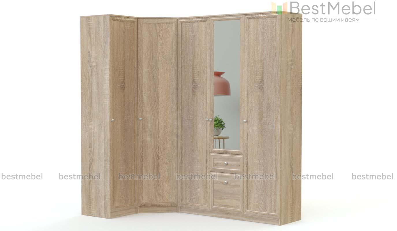 Угловой шкаф Марта 2 BMS поможет вам выгодно использовать особенности планировки и разместить большое количество вещей. Композиция объединила угловой модуль, пенал и трехдверный платяной шкаф, дополненный двумя выдвижными ящиками для мелочей и ростовым зеркалом. Модель с традиционными рамочными фасадами выполнена в насыщенных древесных тонах и прекрасно смотрится в классическом интерьере. Купить угловой шкаф Марта 2 BMS для спальни или просторной прихожей вы сможете в нашем интернет-магазине.