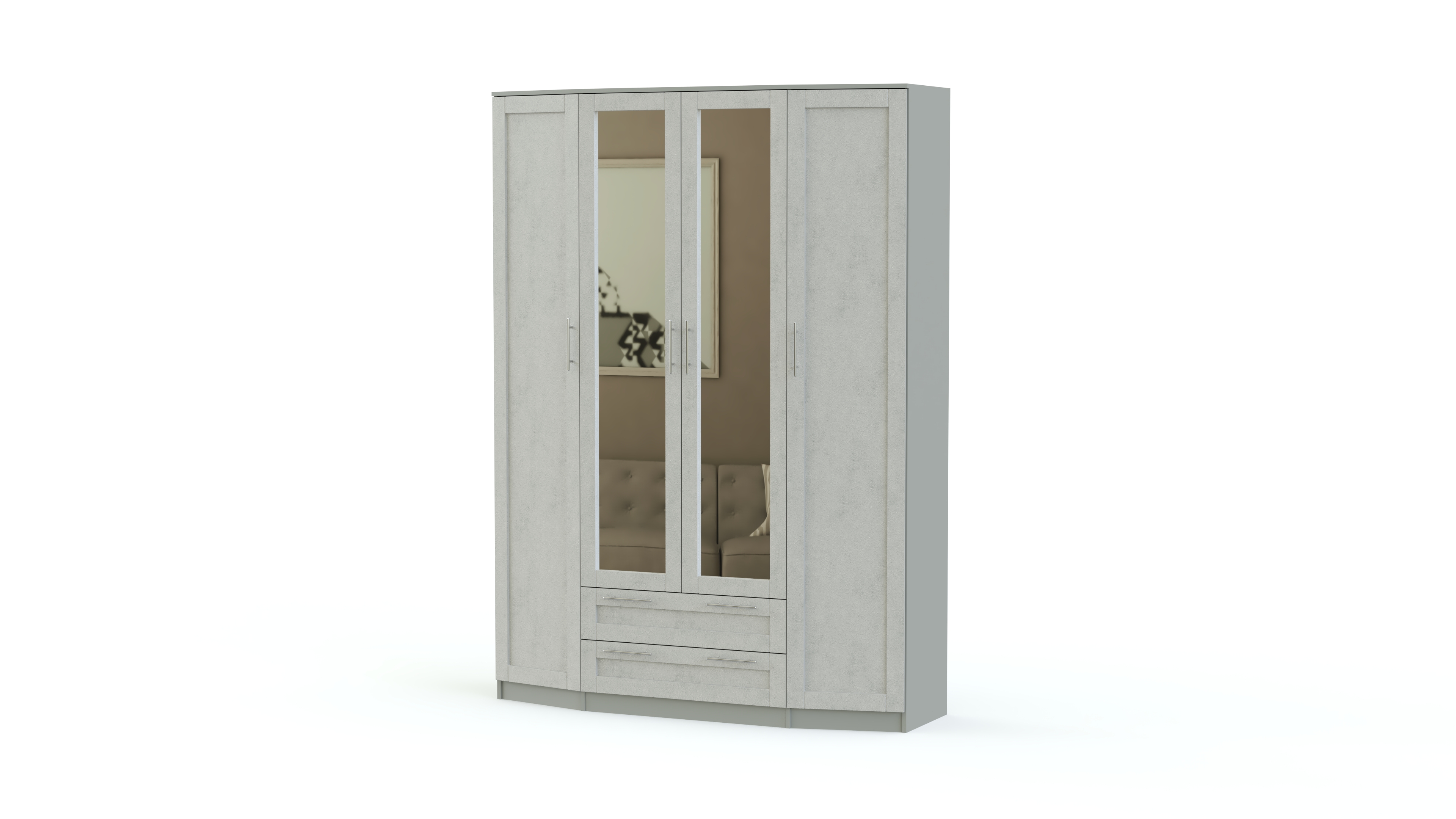 Стильная спальня Скандинавия BMS будет одинаково хорошо смотреться в современном помещении и комнате классического стиля. В ее оформлении удачно сочетаются простые формы, функциональность и интересный декор фасадов естественных древесных оттенков. В комплект входит состоящий из центрального с зеркалами и двух боковых скошенных элементов вместительный шкаф, удобный комод с навесным зеркалом, двуспальная кровать и две тумбы. Особенно выгодной покупка этого гарнитура будет в нашем интернет – магазине.