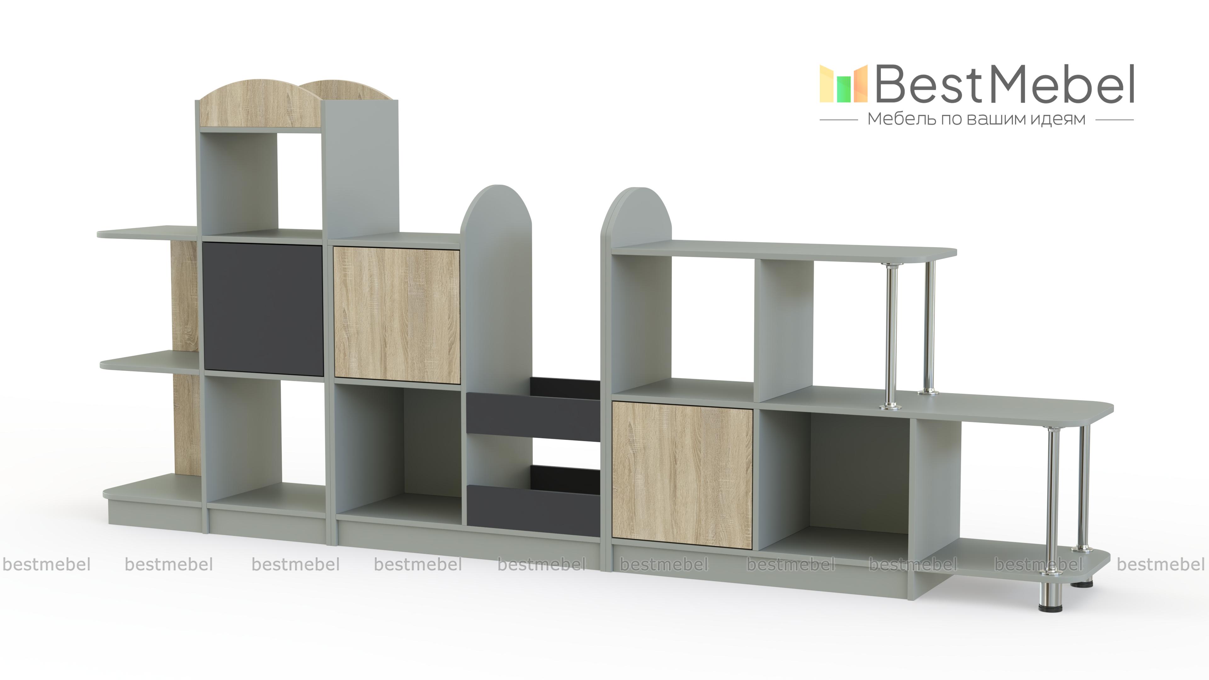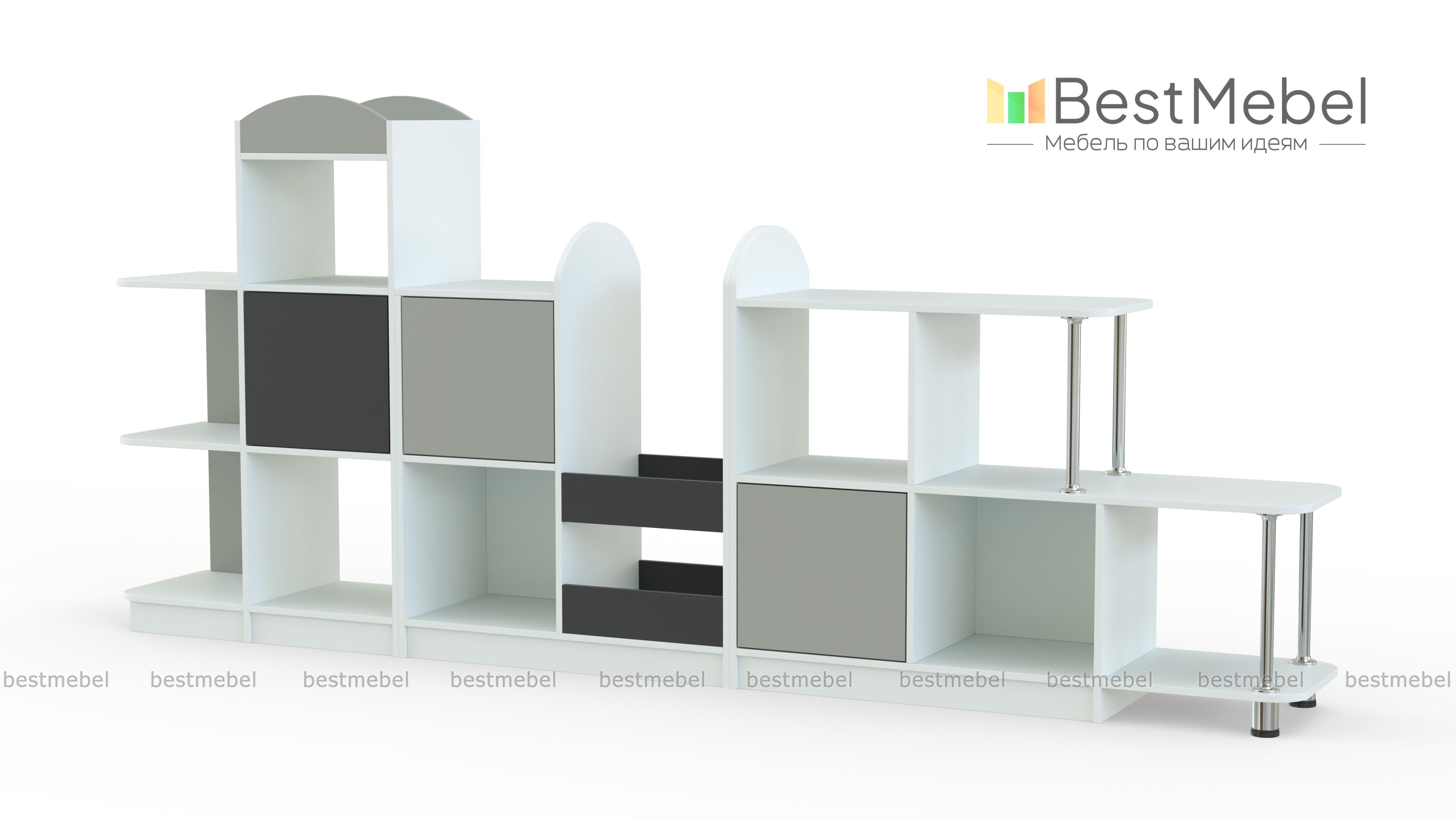 Стеллаж Полли 1 BMS – это игровая модульная стенка, которая поможет рационально организовать пространство. Композиция включает в себя модули разной высоты, оборудованные открытыми секциями, глухими распашными отделениями и полочками на хромированных опорах. Корпус стеллажа выполнен в светлых древесных тонах, а фасады с декоративными элементами – контрастные. Все углы стеллажа скруглены для безопасности. Купить стеллаж Полли 1 BMS для хранения книг и игрушек вы всегда сможете в нашем интернет-магазине.
