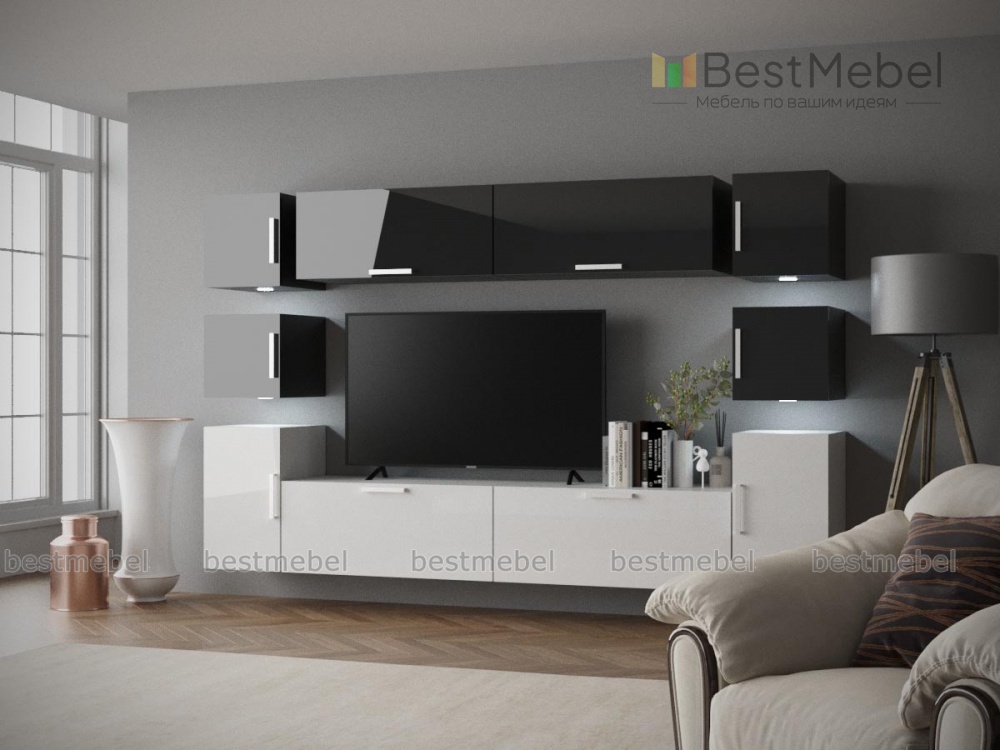 Модель ультрасовременного дизайна КУБИКО V-1 BMS идеально впишется в интерьеры стиля минимализм и хай-тэк. Стенка отличается простыми геометрическими линиями, лаконичным дизайном и высокой функциональностью. Конструкция представляет собой гармоничное сочетание нескольких модулей – тумбы под ТВ, навесной закрытой секции и боковых напольных и навесных распашных шкафов. Фасады стенки выполнены в модном глянце контрастных цветов и оборудованы системой открывания без ручек.