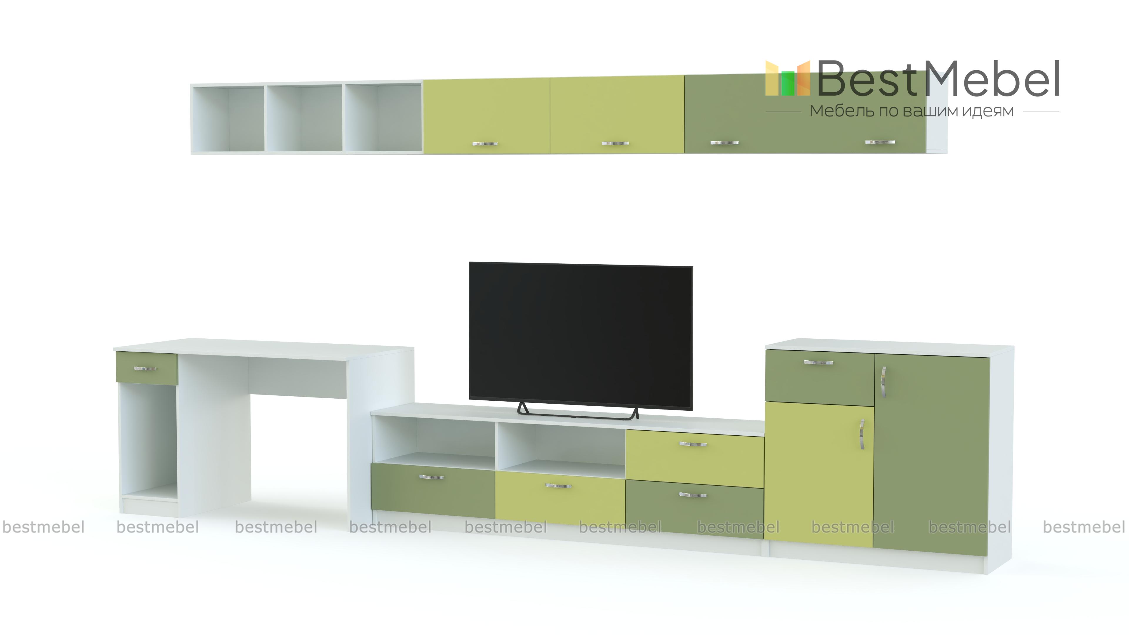 Стенка с рабочей зоной Мирикл BMS – это яркая минималистичная композиция для меблировки небольших современных гостиных, студий и молодежных комнат. Вы сможете объединить рабочее место с зоной размещения ТВ и значительно сэкономить пространство. Модульный комплект в контрастных тонах включает в себя компьютерный стол, низкую тумбу под аппаратуру, высокую тумбу и навесные полки с открытыми и глухими фасадами. Купить стенку с рабочей зоной Мирикл BMS приглашаем на сайт нашего интернет-магазина.