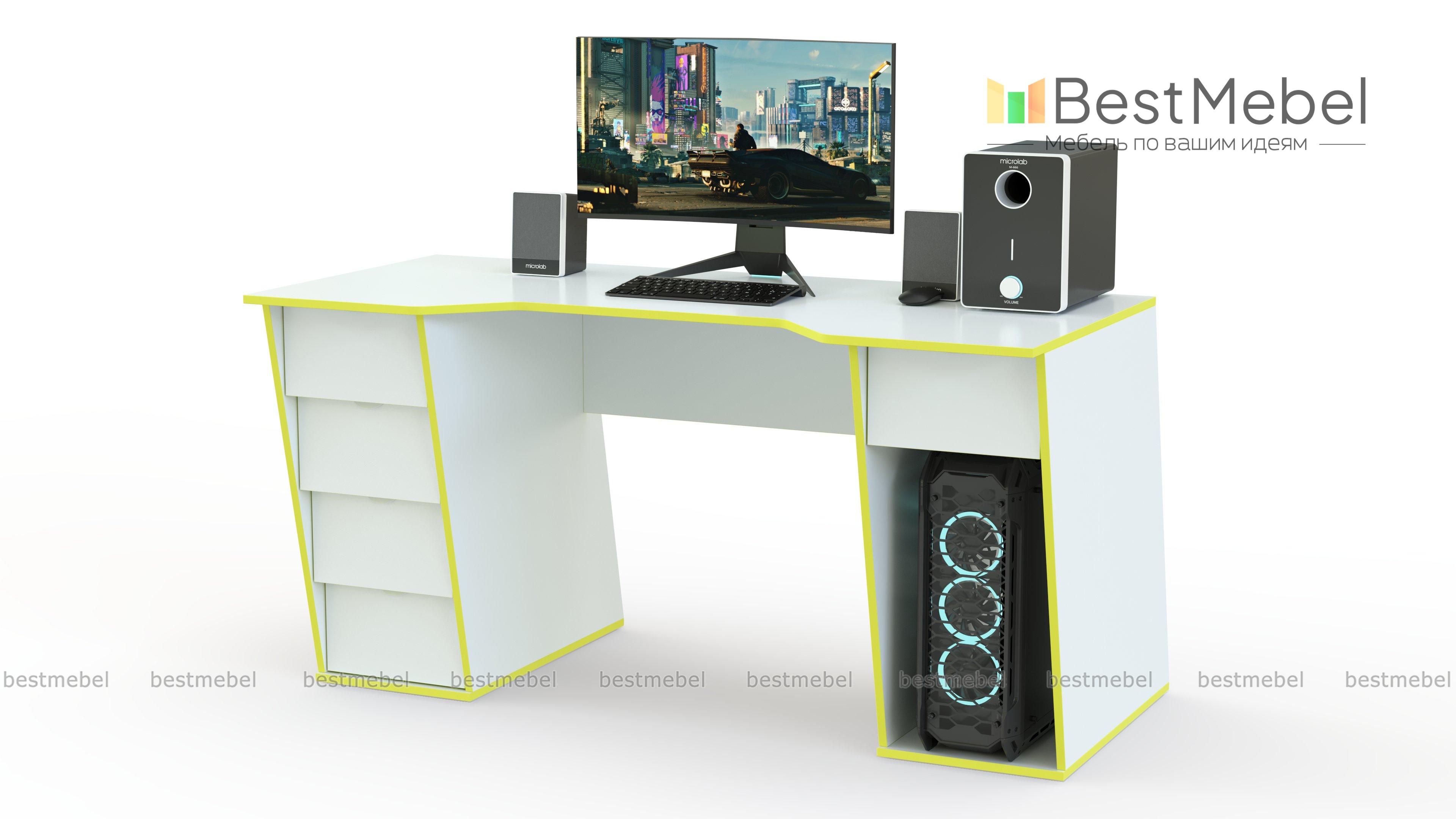 Геймерский стол Скилл тип 6 BMS – это двухтумбовая модель с широкой столешницей, на которой разместятся монитор и современная периферия. Пять выдвижных ящиков легко решат проблему большого количества мелочей, а для системного блока предусмотрена просторная ниша. Эффектная модель со скошенным фасадом имеет трапециевидный вырез для удобного положения во время игры и снижения нагрузки на локти. Купить геймерский стол Скилл тип 6 BMS вы сможете на сайте нашего интернет-магазина.