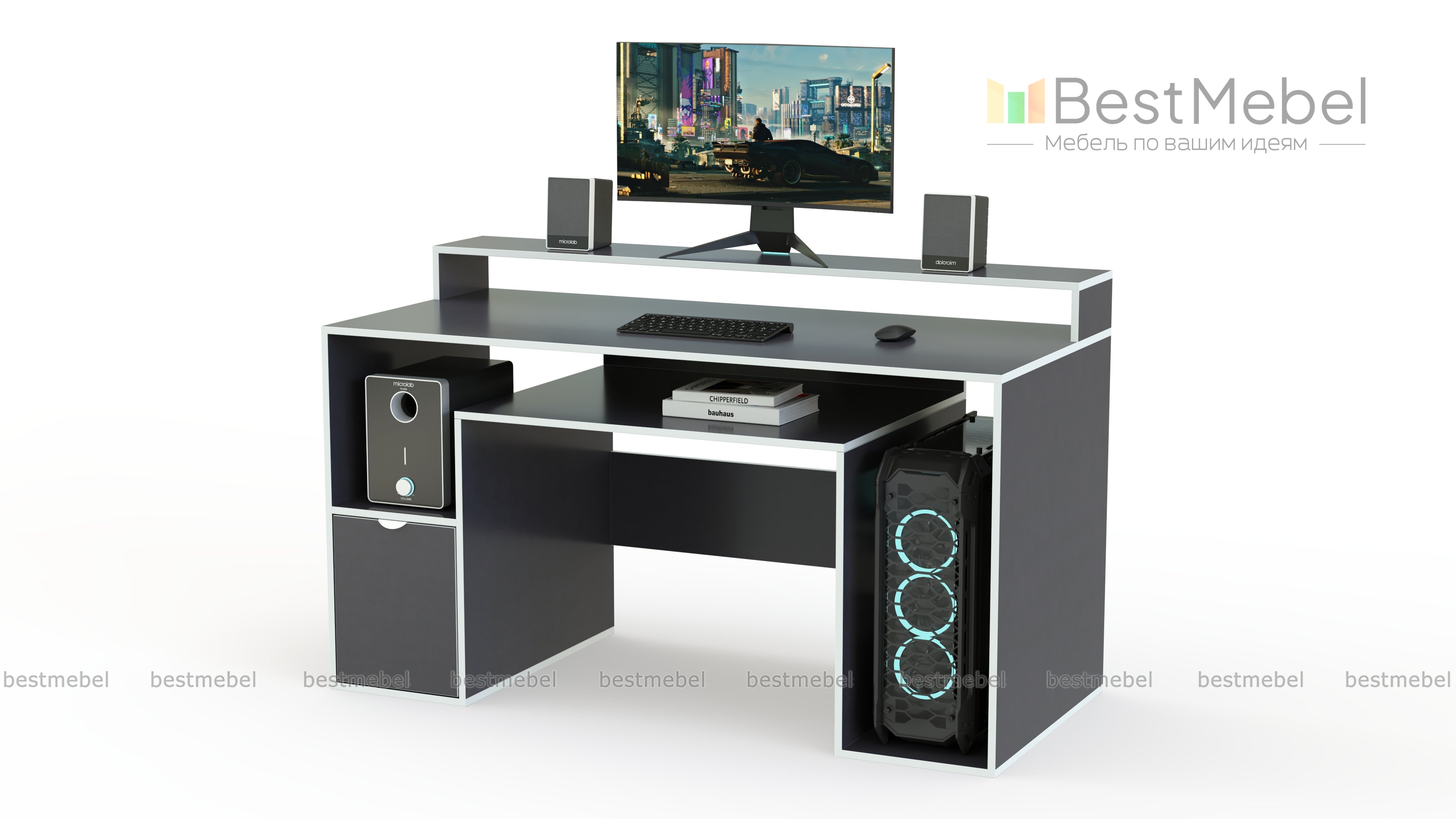 Игровой стол Диего-8 BMS отличается креативным дизайном и особенной устойчивостью благодаря прямоугольной форме. Надстройка на столешнице поможет освободить рабочую поверхность, разместив монитор и периферийные устройства, а для рабочих материалов и системного блока предусмотрены ниши и глухое распашное отделение. Контрастная черно-белая гамма станет прекрасным выбором для современного минималистичного интерьера. Купить игровой стол Диего-8 BMS с возможностью изменения цвета и размеров приглашаем в наш интернет-магазин.