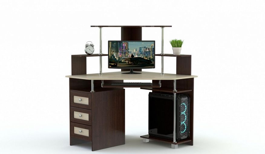 Компактный и стильный компьютерный стол Млайн 34 понравится тем, кто ценит высокое качество и функциональность. Хорошо организованная рабочая зона позволяет разместить как необходимую компьютерную технику, так и дополнительные мелочи. На широкую столешницу поместится монитор с любой диагональю. Системный блок можно удобно установить внизу на специальной полочке. Наличие нескольких открытых полок и выдвижных ящиков позволяет разместить колонки, диски и документы. Купить этот стол можно у нас.