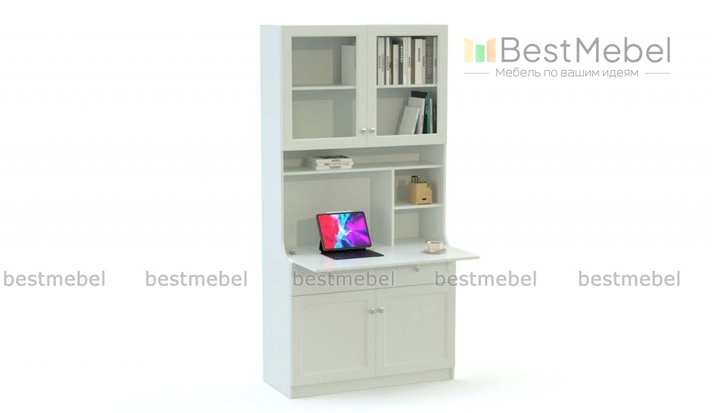 Компьютерный стол-трансформер Алтай 4 BMS объединил функции книжного шкафа и рабочего стола. Элегантная классическая модель с рамочными фасадами, выполненными в светлых белых тонах, оборудована застекленными полками в верхней части, а в нижней располагаются два выдвижных ящика и глухие распашные отделения. Благодаря откидной столешнице вы легко превратите шкаф в комфортное рабочее место. Купить компьютерный стол-трансформер Алтай 4 BMS приглашаем к нам в интернет-магазин с выбором фурнитуры и цвета по каталогу.