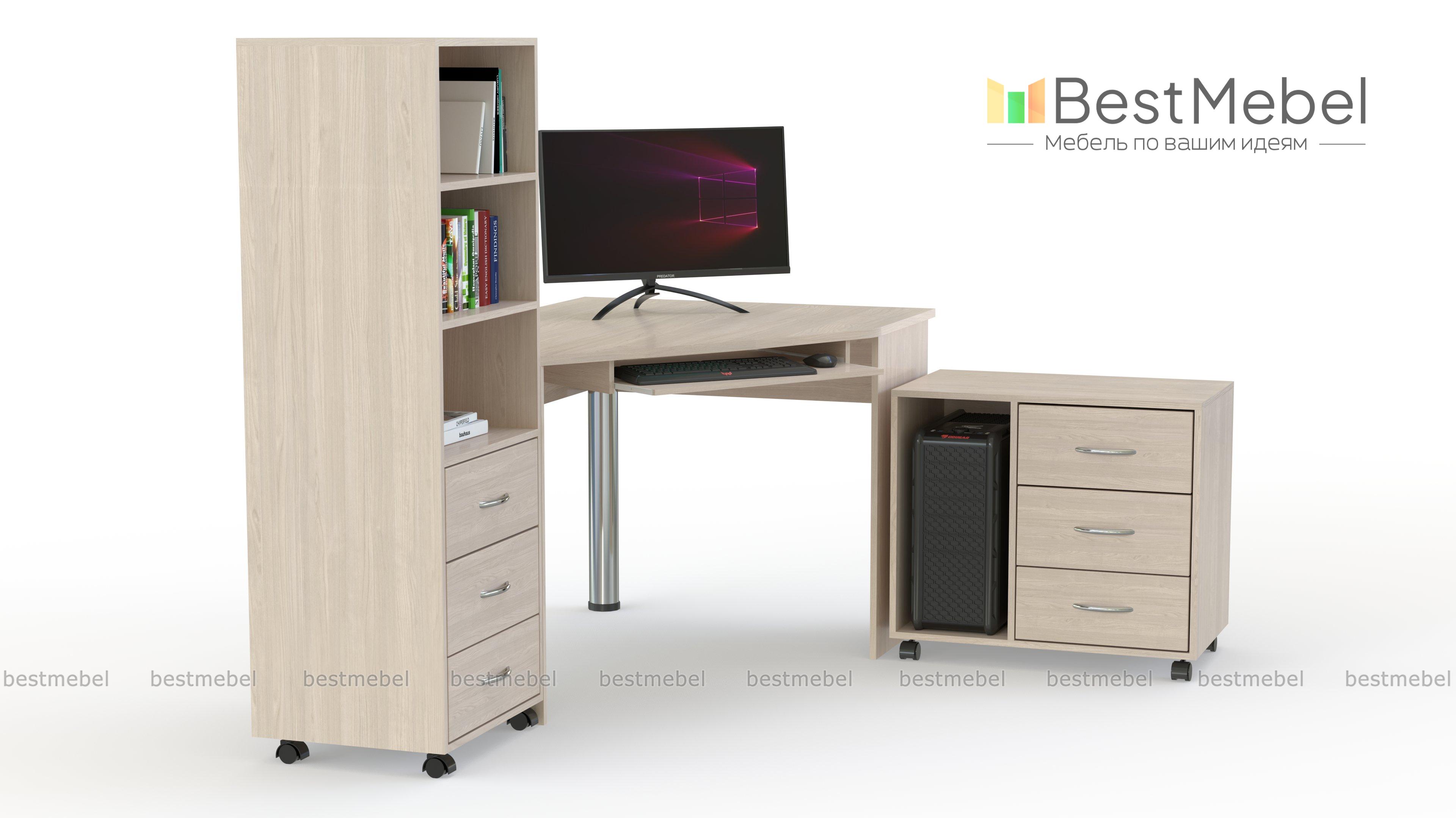 Компьютерный стол Вероника 01 BMS представляет собой многофункциональную композицию для офисного или домашнего интерьера. Благодаря угловой форме модель рационально использует пространство, скругленная столешница дополнена выдвижной панелью под клавиатуру. Для максимально удобного размещения в зоне быстрого доступа папок, канцелярских принадлежностей, оргтехники и системного блока предусмотрены комбинированный стеллаж и приставная секция с тумбой на колесных опорах. Купить компьютерный стол Вероника 01 BMS приглашаем в наш интернет-магазин.