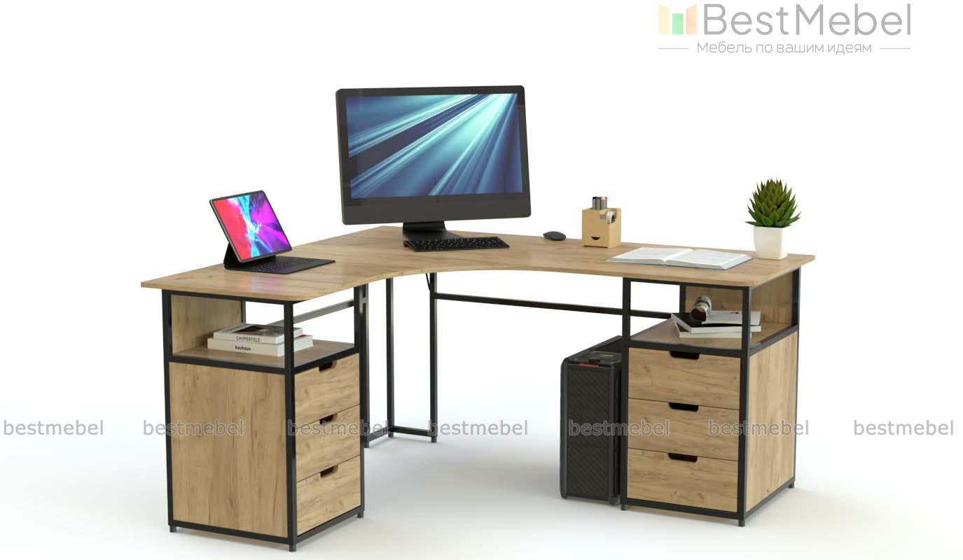 Стол компьютерный Кассандра 5 BMS имеет практичную угловую конструкцию и поможет рационально организовать пространство. Модель в стиле лофт выполнена из ЛДСП природных древесных тонов на легком и прочном металлическом каркасе. Для удобного размещения монитора, оргтехники, канцелярских мелочей и рабочих материалов стол оборудован просторной столешницей с эргономичным вырезом и двумя тумбами с нишами и выдвижными ящиками. Купить стол компьютерный Кассандра 5 BMS для работы или учебы вы сможете в нашем интернет-магазине.
