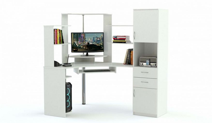 Стол угловой компьютерный Myau СУ-12 BMS многофункционален, имеет угловую конструкцию, что позволяет поместить его в углу помещения, экономя площадь. Он оснащен подставкой под монитор, выдвигающейся панелью для клавиатуры, несколькими открытыми полками. К столу пристраивается довольно высокий шкаф с вместительными отделениями за распашными дверками, нишей и двумя выдвижными ящиками. Это позволит содержать в полном порядке все документы, литературу, канцелярские принадлежности, разные нужные мелочи. На открытой полке удобно размещается различная оргтехника (сканер, принтер, факс). Есть подставка для установки системного блока. Столешница и полки имеют плавные округлые формы, что придает изделию изящество. Стильно и современно смотрятся подставки из никелированных трубок. Купить качественный стол можно на нашем сайте, скорректировав параметры на свое усмотрение.