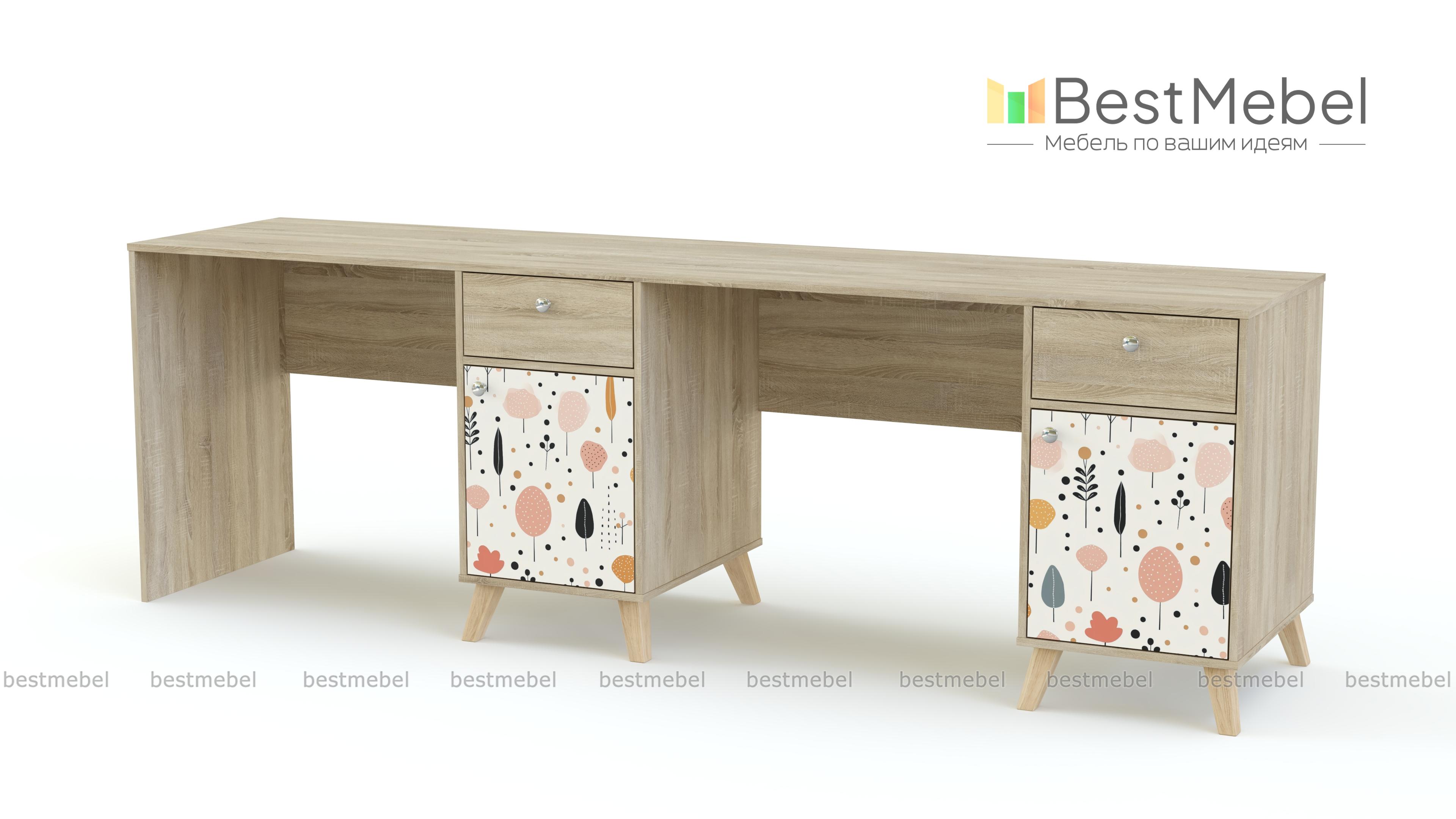 Письменный стол для двоих Эльза 2 BMS поможет обустроить рабочую зону с комфортом для всех. Рабочая столешница широкая, а для хранения канцелярии и тетрадей у каждого ребенка будет своя тумба, оборудованная ящиком и отсеком с распашной дверцей. Конструкция из ЛДСП надежная и долговечная, в спокойную цветовую гамму добавлены древесные акценты и стильная фотопечать. Купить письменный стол для двоих Эльза 3 BMS вы сможете в нашем интернет-магазине с изготовлением по индивидуальным размерам.