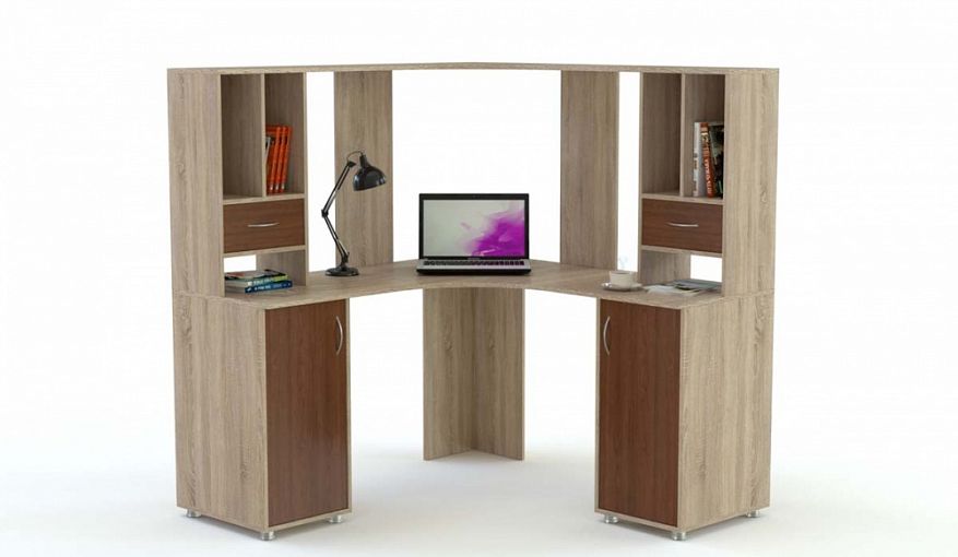 Письменный стол Роберт-8 BMS – это удобство, практичность и красота. Угловая конструкция позволяет поставить его в любой свободный угол помещения, где можно создать комфортное и уютное рабочее место, которое понравится и школьнику, и работнику офиса. На просторной столешнице можно установить монитор компьютера или ноутбук, разложить чертежи, конспекты, учебники. На полках надстройки расставить папки с документами, справочники. У модели имеются две вместительные тумбы с полками за распашными дверями и оригинальные выдвижные ящички, удобно расположенные над столом. Чтобы оживить интерьер помещения, хорошо поставить на верхние поверхности надстройки любимые фотографии в красивых рамках, цветы, сувениры. Изделие можно заказать в различных оттенках, которые представлены на нашем сайте. Купите качественный письменный стол Роберт-8 BMS у нас, пока он продается по выгодной цене.